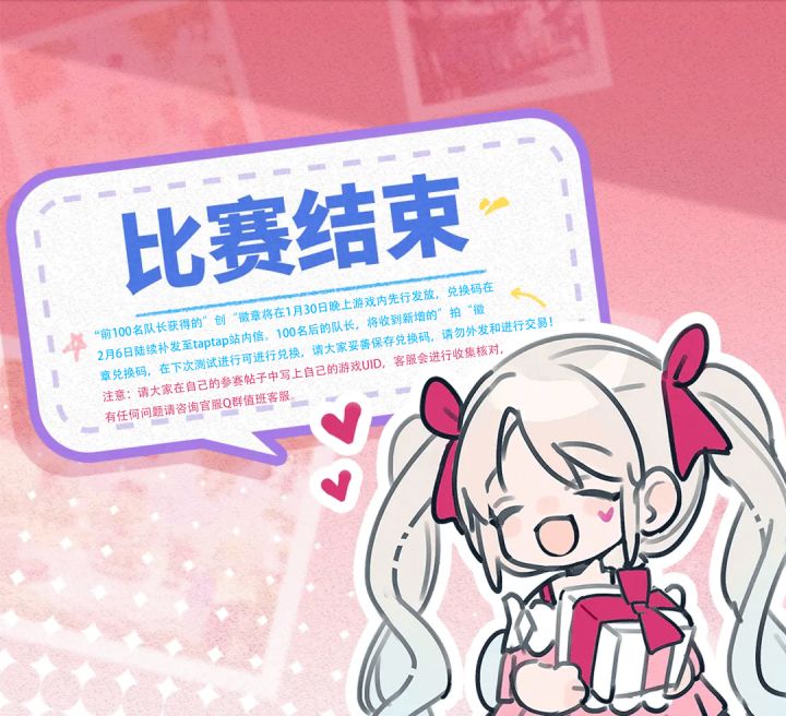 《开放空间》「瓶中小聚」街拍大赛结束!点下边链接可查看大家拍的优秀照片,非常感谢大家的参与!https://www.taptap.cn/act-album/O9s5uuV4D2————————奖励发放说明———————————【街拍大赛】活动奖项发放说明:前100的玩家所获的“创”徽章将在活动结束当天发放至游戏内,发放时间1月30日20:00陆续发放。另外!100名之后的队长,我们会单独