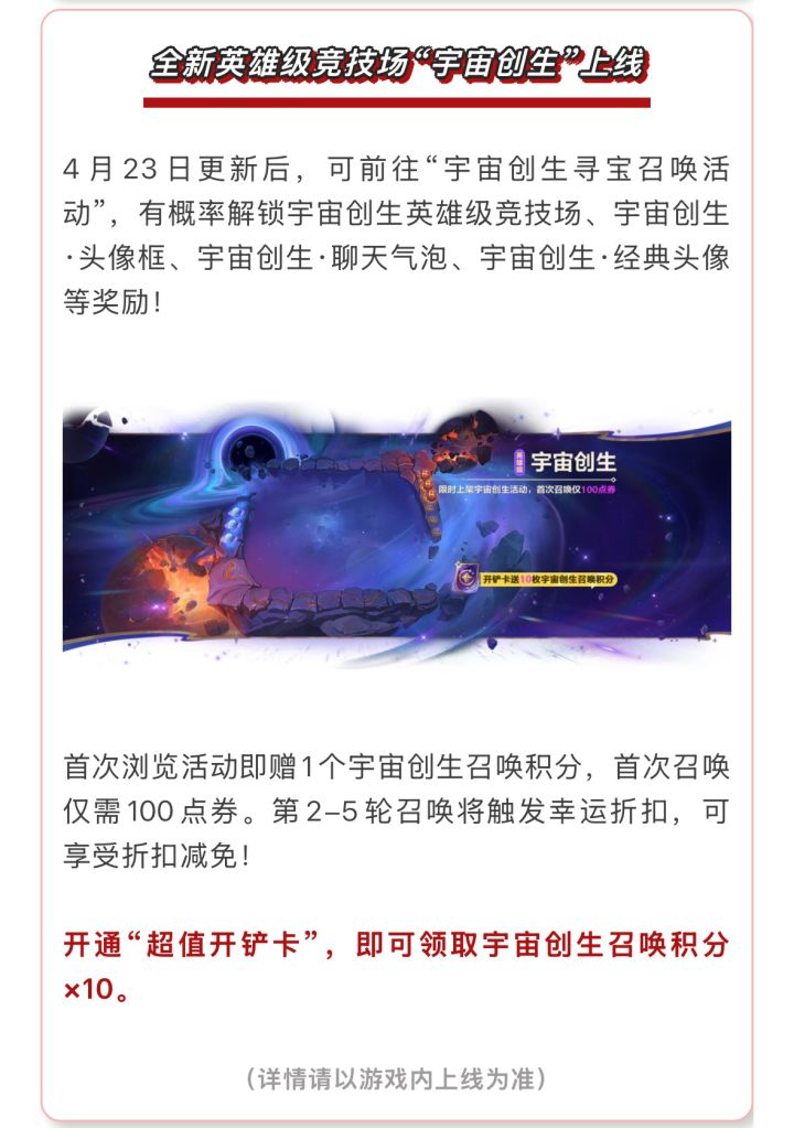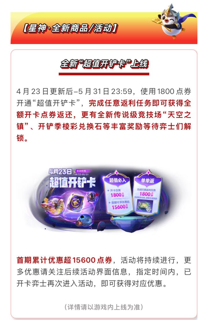 近日,金铲铲之战正式敲定新赛季时间,4月23日将迎来大版本更新,不仅开启全新星神赛季,还会同步上线英雄联盟传奇经典赛季,双赛季并行的设定让玩家眼前一亮。 新版本一口气放出超多活动与优惠内容,霓虹盛典抽奖活动限时开启,多款热门小小英雄集体登场。同期上线的霓虹补给站门槛很低,十八元就能兑换点券,还额外赠送抽奖机会,第一次抽取直接免费,性价比十分可观。 超值开铲卡活动也会同步上线,解锁后福利价