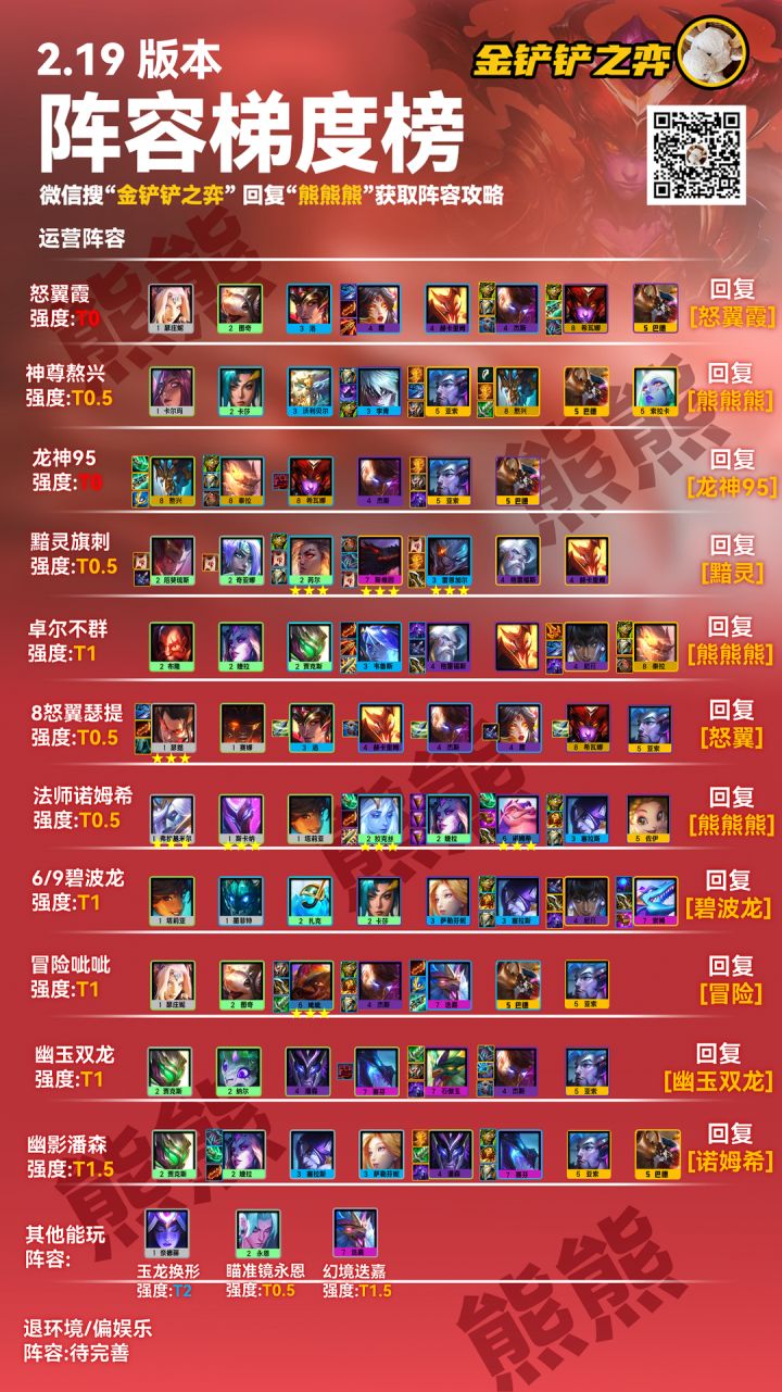 大家好,我是熊熊熊。今天带来铲铲2.19版本【阵容推荐】。包括5套主流上分阵容、3套特定情况必玩阵容以及数套新版潜力阵容。新版阵容强度已更新。主流上分推荐5套阵容:龙神95、怒翼霞、瑟提、星界龙、传统黯灵狮子狗NO:1 龙神959人口阵容:熬兴、泰拉、艾达斯、希瓦娜、巴德、洛目前这样搭配的比较多,当然其他亚索、索拉卡质量够肯定都能上;强度依然是版本T0,就是难以成行;当前版本加分项是5