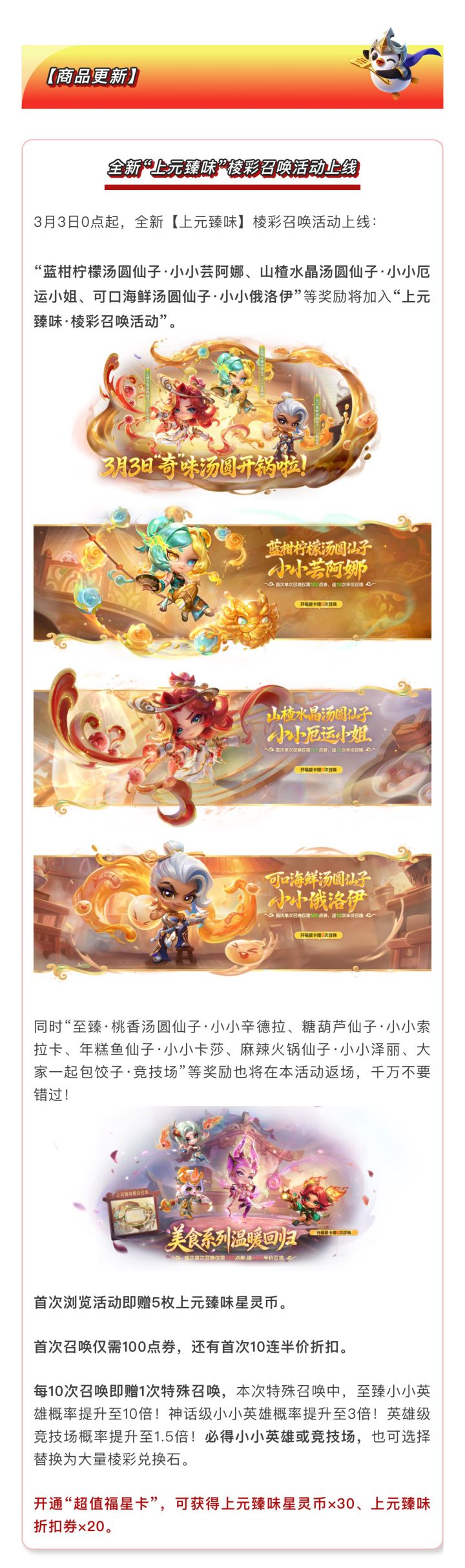 🏮新年迎福星,怎么少得了恭喜发财——3月3日,【2026天选福星恭喜发财】即将登场! 🌟喜聚八方来财,三星多多益善!快来金铲铲之战一起“恭喜发财”吧!✨上元臻味 棱彩召唤 一年一度的元宵节快要到了,汤圆仙子们准备好了各式各样的花样汤圆,可爱又可口,蓝柑柠檬、山楂水晶,还有可口海鲜!弈士们准备好亲自尝一尝了吗? 3月3日0点后,【上元臻味】棱彩召唤开启,全新神话级小小英雄登场——【蓝柑柠檬汤