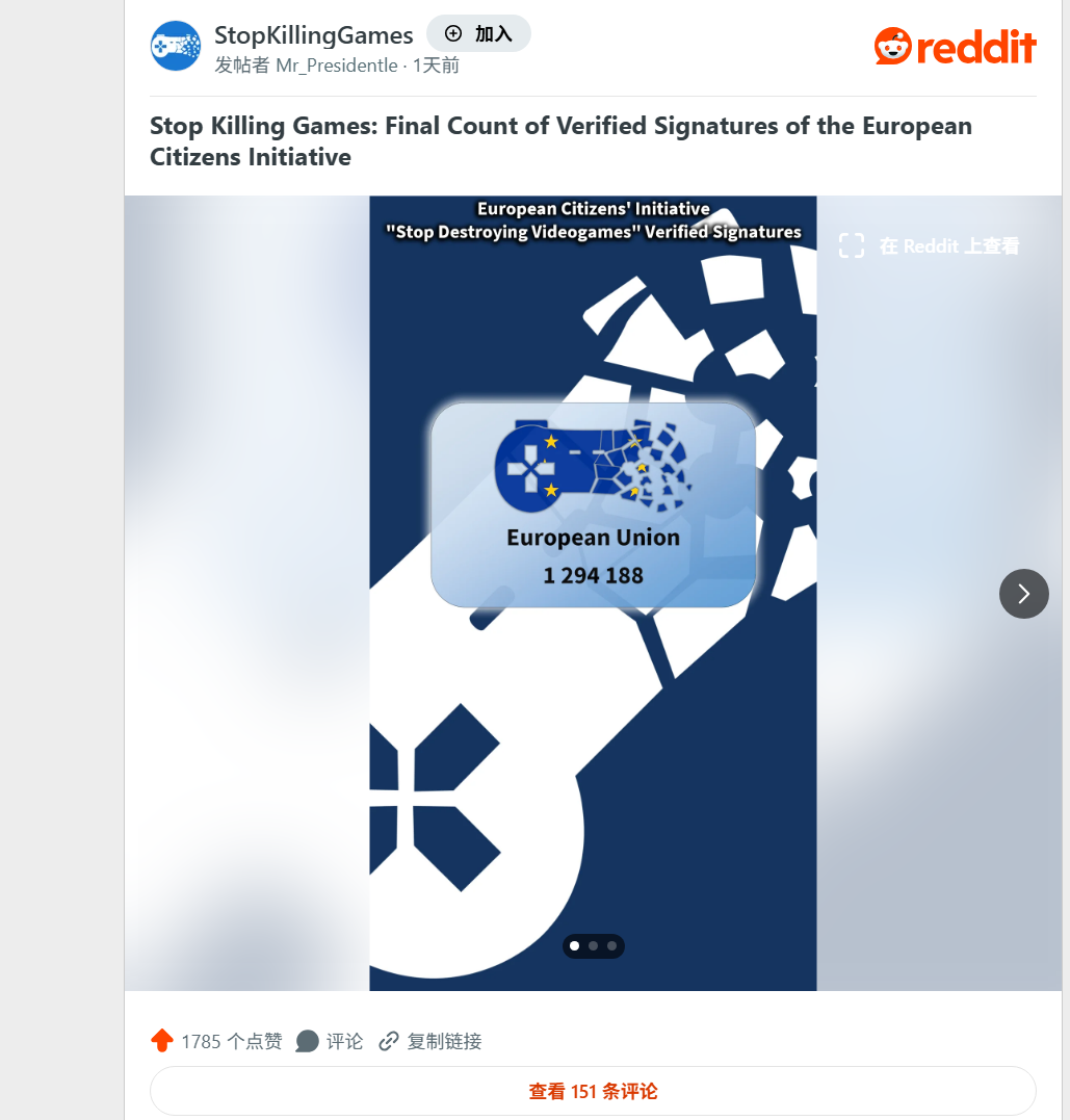 “停止杀戮游戏”(Stop Killing Games)运动迎来了历史性的里程碑。根据志愿者Moritz Katzner在官方社区发布的最新通报,欧盟官方已完成对该项“欧盟公民倡议”(ECI)的签名核验工作。结果显示,在提交的约145万个签名中,共有1,294,188个签名被确认为真实有效,这一数字远超欧盟委员会受理所需的100万最低门槛。高达89%的有效率:玩家的胜利此次核验结果令人振奋的一