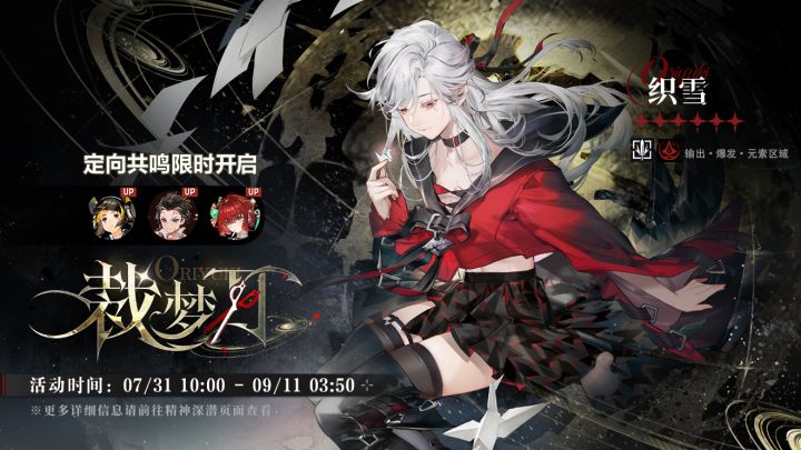▶开放时间07/31 10:00 - 09/11 03:50▶UP同调者★6织雪★5襄铃、禺期、卡洛琳更多详细共鸣信息,监督可登录游戏获取。 #白荆回廊 #灼愿千重庆典 #当祢如是说