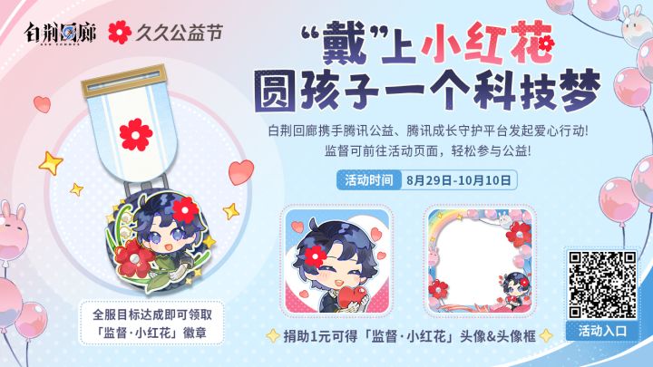 白荆回廊携手@腾讯公益 @腾讯成长守护平台 发起爱心行动!助力更多孩子探索AI世界,共圆科技梦想! 活动时间:8月29日-10月10日活动入口:请监督扫描上方二维码参与活动规则:①监督完成每日爱心助力任务,即可获得对应爱心值,点击捐出后全服爱心值捐赠进度条将会增长;全服爱心值捐赠进度条达到25%、50%、75%、100%将对应借锁X晶粒奖励;②当全服爱心值捐赠目标达到100%,监督可于活动