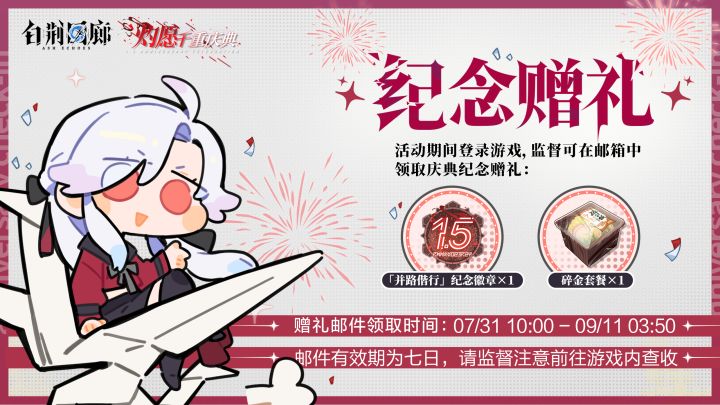 尊敬的监督:我们一同遇见过形形色色的人们,也见证了无数故事的起始与落幕。我们为您准备了一份纪念赠礼,请监督登陆游戏领取。▶「灼愿千重庆典」纪念赠礼内含[并路偕行]1.5周年专属纪念徽章×1,[碎金套餐]×1▶赠礼邮件领取时间7月31日至9月11日期间登陆游戏,即可在邮箱中领取※「灼愿千重庆典」纪念赠礼邮件有效期为七日,请监督注意前往游戏内查收。#白荆回廊 #灼愿千重庆典 #当祢如是