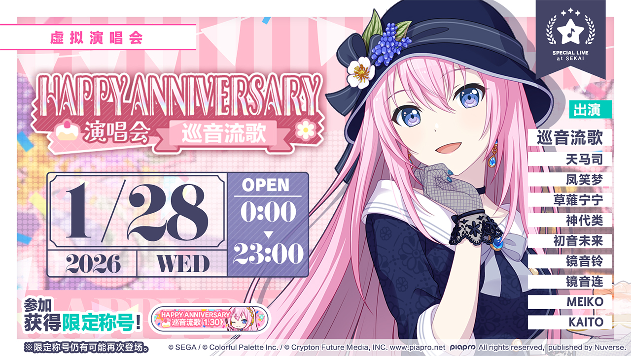 尊敬的各位「世界」居民:我们将于1/28(三)举办「HAPPY ANNIVERSARY 演唱会 巡音流歌 Stamp」。将会由Wonderlands×Showtime和六位虚拟歌手共同为大家带来精彩演出✨【场次及开放时间】1/2800:00、01:00、02:00、08:00、12:0018:00、19:00、20:00、21:00、22:00、23:00欢迎各位居民前往观看,一起庆
