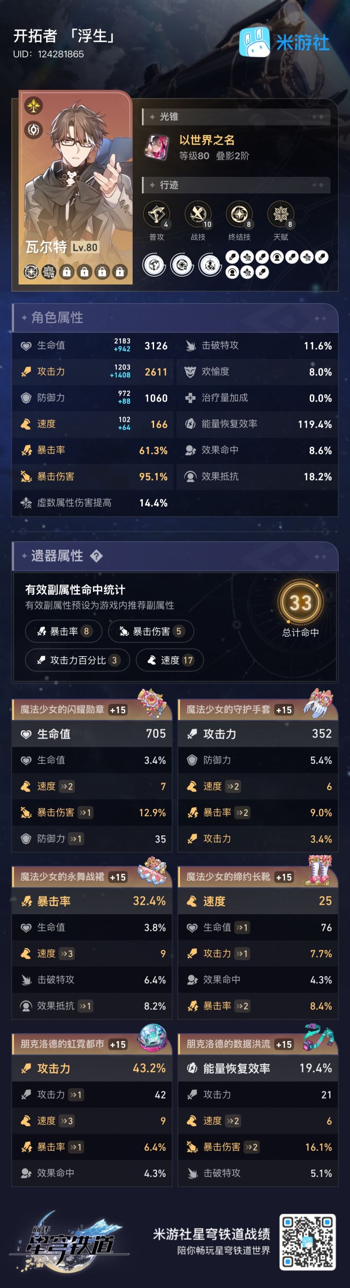64+9(行迹)+18(专光)+110=201速 暴击局内90 61.3+18.7(行迹)+10(爻专) 小毕业了
