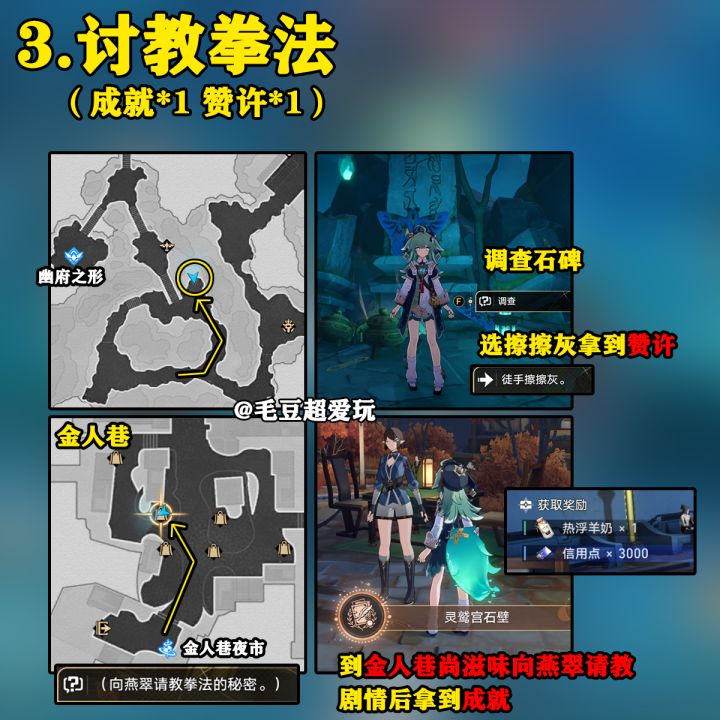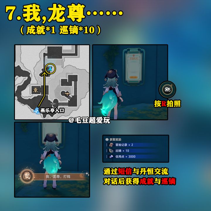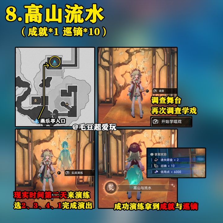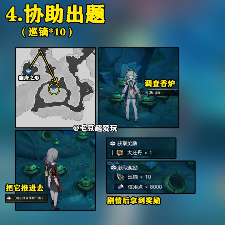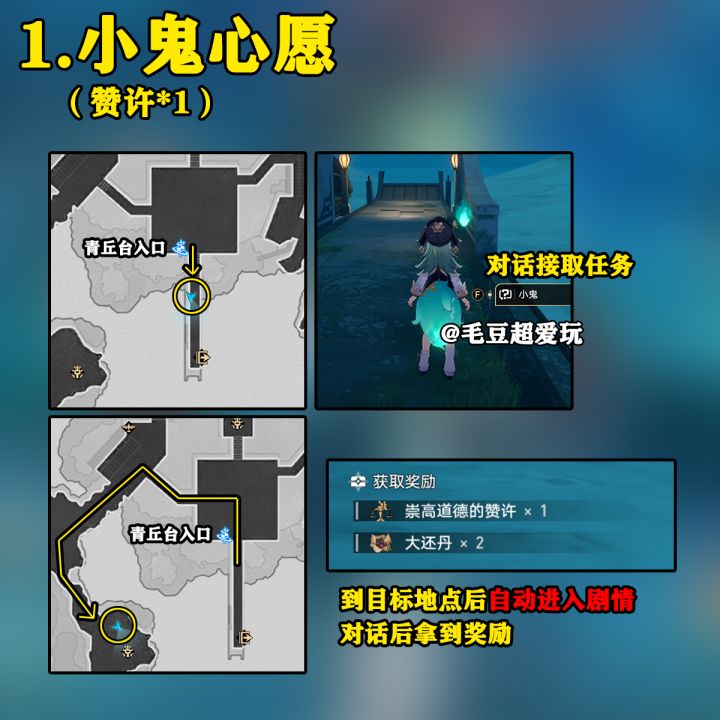【崩坏:星穹铁道】UID:102444222这里是毛豆,本期为大家带来的是1.5版本绥园地图内的隐藏任务攻略,希望能对各位开拓者有帮助。进攻略前的小提示:开拓者在版本更新登录后会收到桂乃芬的短信,从短信中接取《游园惊梦》任务,完成任务后开启绥园地图。成就可以领取星琼,巡镝可在仙舟罗浮-「星槎海中枢」“赎珠阁”处兑换道具。01.小鬼心愿(赞许*1)。与青丘台入口旁的小鬼对话接取任务,带它去