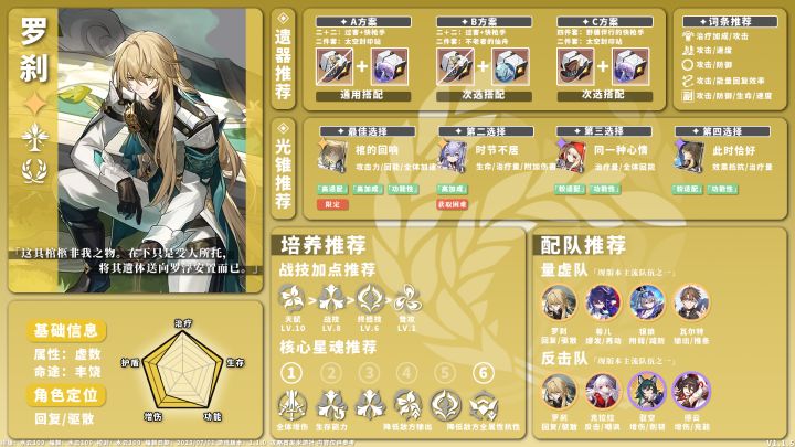 UID 100760002各位开拓者好,我是澈晓。今天为大家带来1.0版本全角色光锥遗器配装推荐。相较于上一版,本期将光锥和遗器合在一篇,为大家更集中的带来全角色配装方面的攻略,在未来也会保持将两部分内容合在一起放出。由于全角色系列每期都会有或多或少的调整,且由于目前处于游戏前期,因此对于部分角色的配装细节会有或大或小的争议。如果对于这方面内容有疑异,非常欢迎在评论区指出,对于一些合理的修改