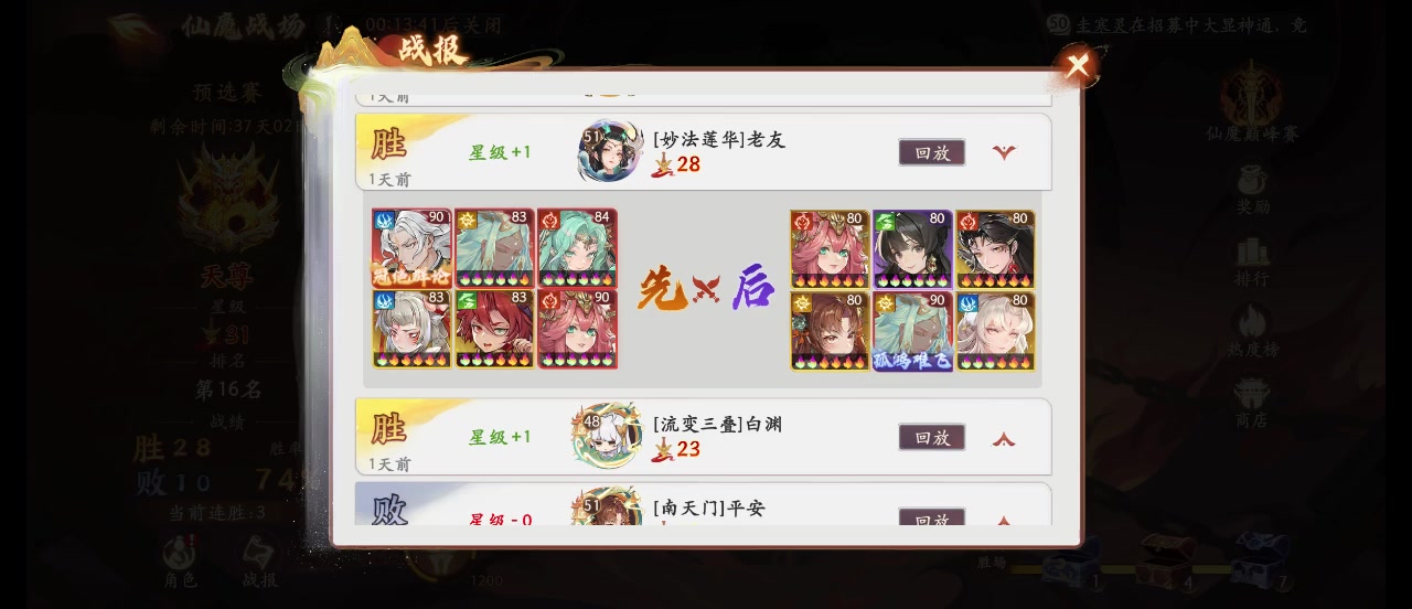 其实第一天90%胜率就打到了天神!上了天神后到今天(我也记不清了三天了还是四天的)一只徘徊在5-20星,这套阵容是我这几天经历了无数次的连跪,被对面核爆一波的,被卡速度专门掏裆的杨戬掏的,今天我又稍微改善了下最终就是这套打了上去,当然不是最好的配置,是最适合自己氪的,抽卡的实际情况等等,听别人说的是不用的,别人说的都是适合他自己的,如何你氪度没他多或者抽卡情况不一样,披挂等等只要有一点不一样就有可