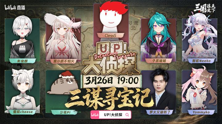 寻宝聚群英,谋定天下事!三谋联动《UP!大侦探》开启特别直播节目 “三谋寻宝记”。 这一次,大侦探们——@罗太又破防了 @Yommyko @黎歌Neeko @雪糕cheese @劉俊朗 @少年Pi @子言姐姐 @ClessS @宣小纸不怕火 将化身寻宝大师,在三国世界开启一场探索珍宝之旅。万元大奖静待赢家,究竟谁能脱颖而出,让我们拭目以待!整场节目高能不断,三大精彩环节轮番上演