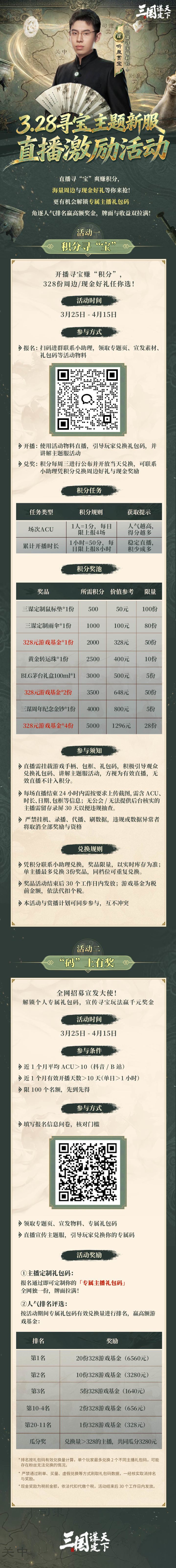 #三国谋定天下 #克里马擦去寻宝 #328全民寻宝狂欢 #品宝论英玩法 3.28 寻宝主题新服「直播激励活动」即将开启!来三谋和听泉一起“寻宝”狂欢!寻宝主题新服「直播激励活动」即将开启!直播 “寻宝” 爽赚积分,海量周边与现金好礼等你来抢!更有机会解锁专属主播礼包码,角逐人气排名赢高额奖金,牌面与收益双拉满!▼ 详细活动信息可见下方长图!