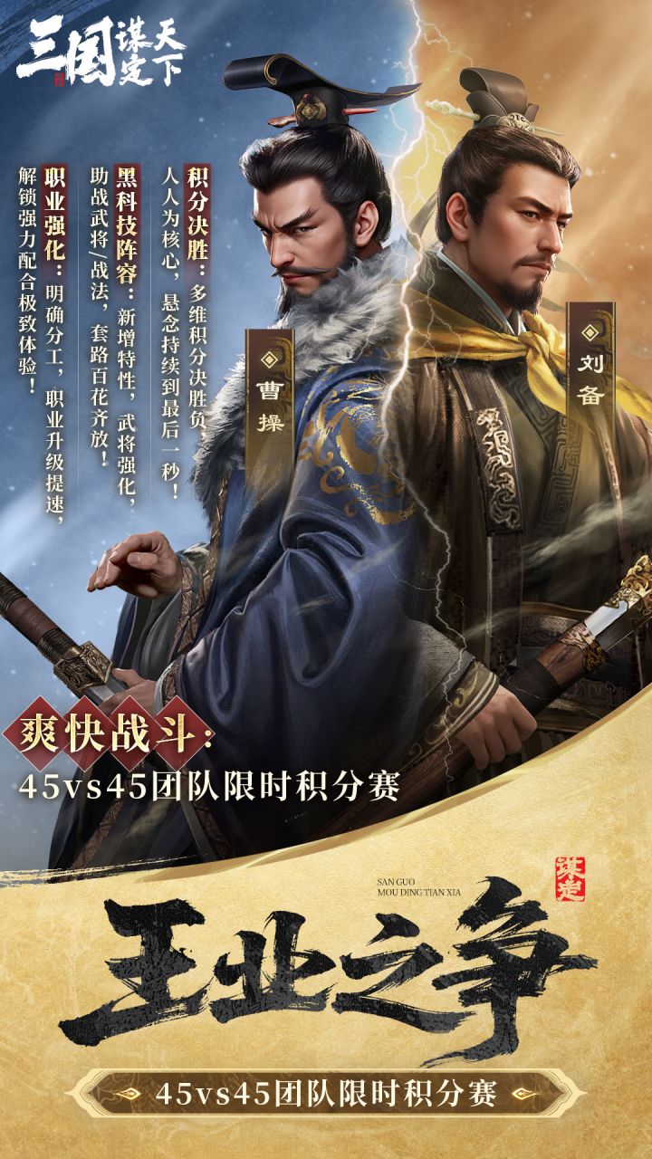 #三国谋定天下 #三谋王业之争即时开打 即时开打,全程高能!聚焦小沙盘战场对决,还原最纯粹极速的策略体验。 「王业之争」玩法已进入最后紧张的打磨优化阶段。 主公们可以在「王业之争」中,体验到以下多重爽点: 体验到限时小团队积分对决赛, 告别繁琐开荒,投入极速战斗, 多线攻防争夺,全程高能激战! 接下来,跟随乔妹一起来了解「王业之争」详细玩法和规则介绍。 更多玩法详情和爆料,欢
