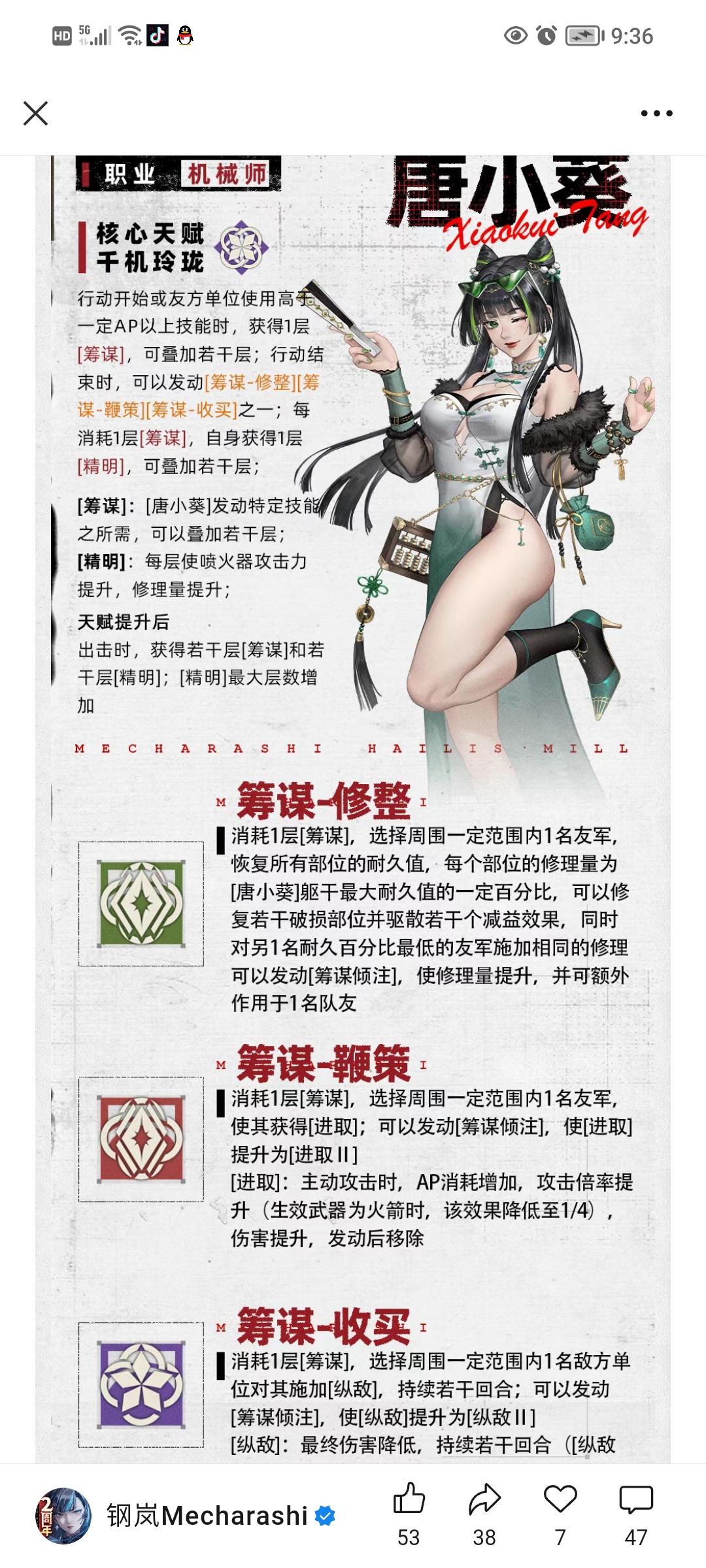 不需要修理背包的机械师,不知道γ技能是啥,我阿戴勒彩了,这个是必须拿个种子的。现在期待的是她是不是轻甲,能不能飞。γ技能是什么?修理距离是多少?