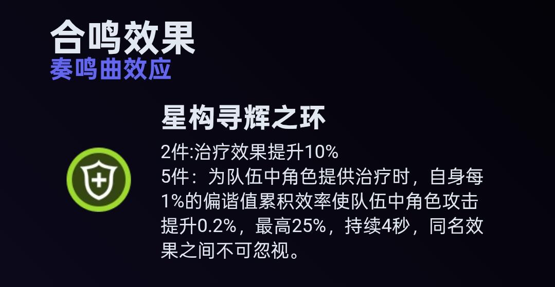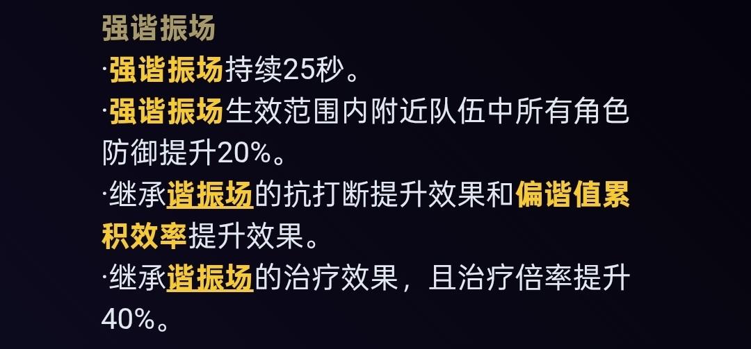 声骸套装加攻25%,自己的效果又是给队友加防20%。这个20%防御加成是唯一一个需要用大招摧毁谐振场并重建强谐振场的新增效果,如果只是单纯想加容错的话,我感觉完全没必要这么麻烦,直接加进谐振场的效果就行,否则一顿操作下来得到一个可有可无的buff,非常莫名其妙。这个20%防御对防御C来说可能还挺重要的,因为如果换成提供20%攻击,4星角色扔个大招就有了,对比起来攻击加成就非常廉价。声骸套装原本