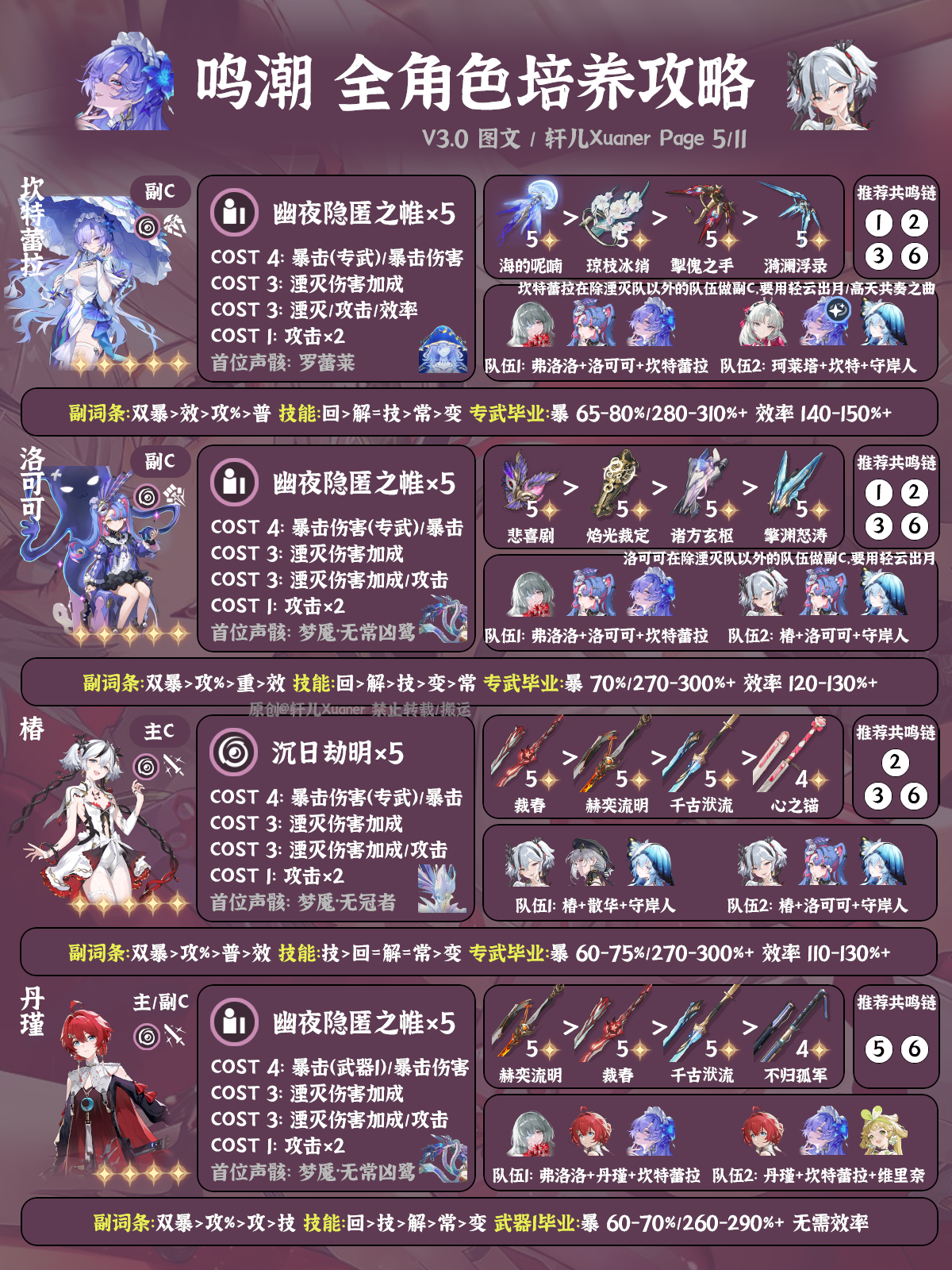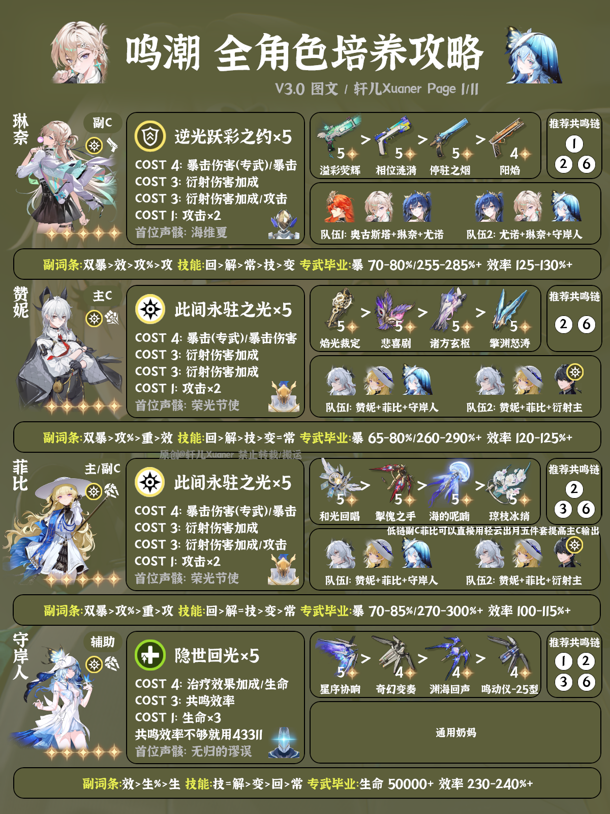 鸣潮最新3.0版本全角色培养一图流来了,截至琳奈共计44名角色。当前主要是给新入坑玩家使用,预计3.0晚些时候/3.1轩儿Xuaner会再更新一版把新的五把常驻武器计算进去,老漂们稍安勿躁~----------------------更新内容① 新增卜灵、琳奈。② 尤诺、相里要、卡卡罗等推荐配队做部分调整。----------------------攻略食用指南① 本篇内容大家可自己