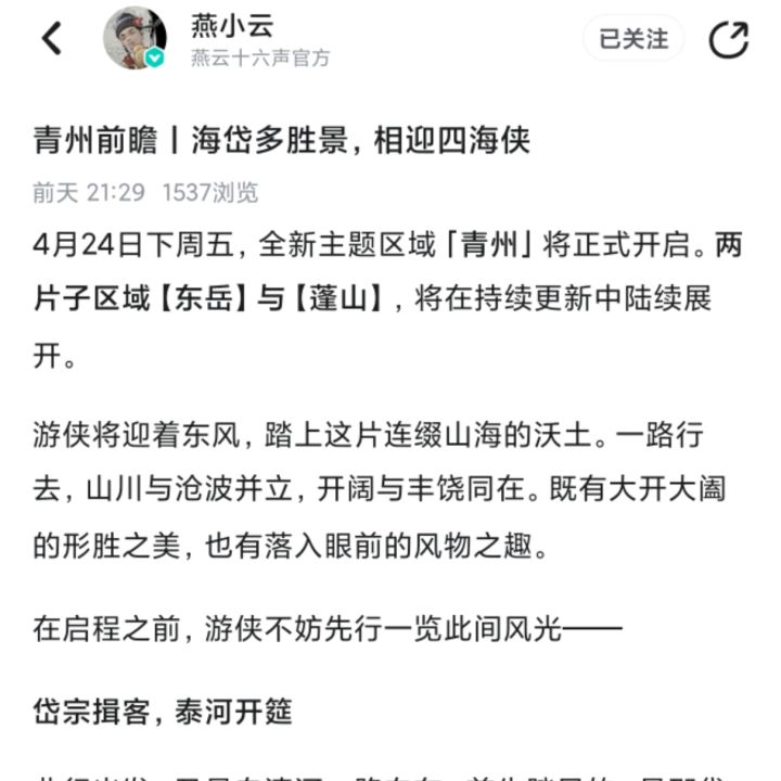 近日,燕云十六声最近节奏太猛了,刚刚又官宣青州俩新地图【东岳】【蓬山】,还带个限定风筝坐骑,直接把玩家讨论度拉满! 东岳主打泰山区域,能爬泰山、观云海,还能逛周边风土人情,喜欢山水探索的玩家直接狂喜,都在盘算上线后第一个冲去登顶看风景。蓬山是黄河入海口,大片滩涂地的实机画面绝美,不少玩家已经开始期待在这儿拍照打卡了。 最绝的是区域专属坐骑“纸鸢”,这不就是潍坊风筝嘛!潍坊风筝在国际上都有