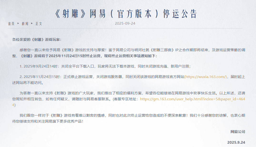 网易旗下MMO游戏《射雕》于今日15时正式停止运营,这一消息此前已通过官方公告公示,停运主因系《射雕三部曲》IP合作期将满及游戏运营策略调整。为答谢玩家多年支持,网易推出专属福利方案保障玩家权益。关于未使用金锭,玩家在停运公告发布后至今日15时前仍可正常使用;截至9月24日14时,账号中未消耗的收费金锭已按等额点数补偿至对应网易账号,可用于网易旗下其他游戏。同时,跨游戏福利覆盖多款热门作品,包