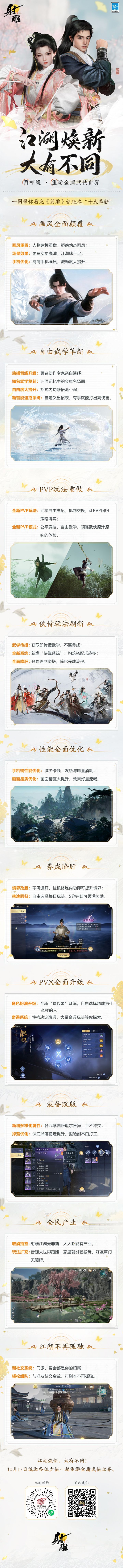 《射雕》全面爆改彻底焕新!更写实的江湖画风,更自由的经典武学;更奇趣的江湖玩法,更传奇的侠义人生!为了还原大家心目中的武侠江湖,#射雕回炉计划 进行了“十大革新”,从画风建模、武学招式到性能优化等全方面重做!希望大家能看到更好的《射雕》!