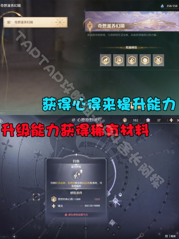 🌷资源篇:1.奇想星:我们需要在大世界中探索获得,每一个地图板块奇想星的数量都是有限的,打开地图看右上角,我们就能看到当前区域的奇想星数量。奇想星是获取服装的重要途径之一。同时我们游玩过程中的所有能力套装都是需要依靠奇想星来解锁的。2.灵感露珠:同样需要在大世界探索获得,和奇想星一样散落在地图各处。灵感露珠是可以找纪念山地的唱诗蓝龙兑换设计图的资源。除了设计图,还可以获得很多稀有道具。3.噗