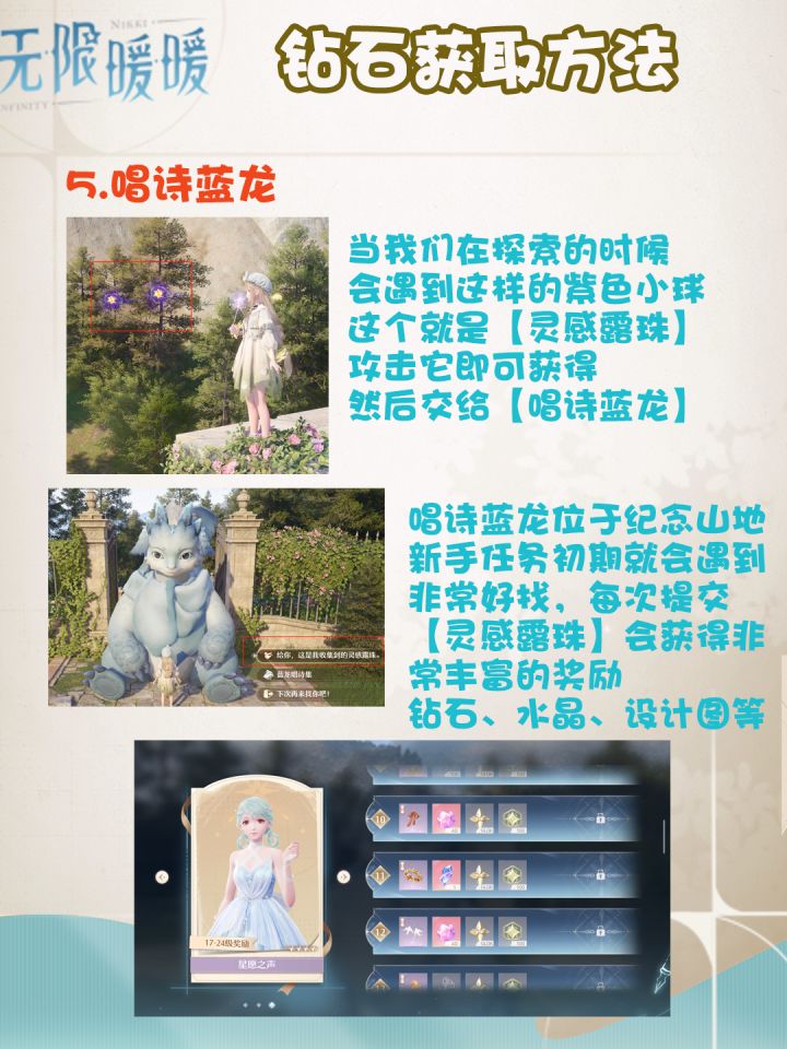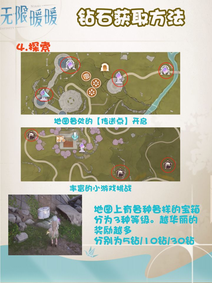 新手入坑最想要知道的就是钻石如何获取只需要1分钟你就可以完全了解游戏的所有钻石产出其中每日任务固定产出90钻/天成就获得5钻/项图鉴评价30钻/每100积分 阶段性积分奖励为100钻宝箱有3种分别是5钻/10钻/30钻传送点(流转之柱)激活20钻势力搭配师挑战10钻/优秀 20钻/完美支线任务:逸事30钻 见闻20钻小游戏通过10钻 完美30钻套装收集20钻/套#无限暖暖全球公测
