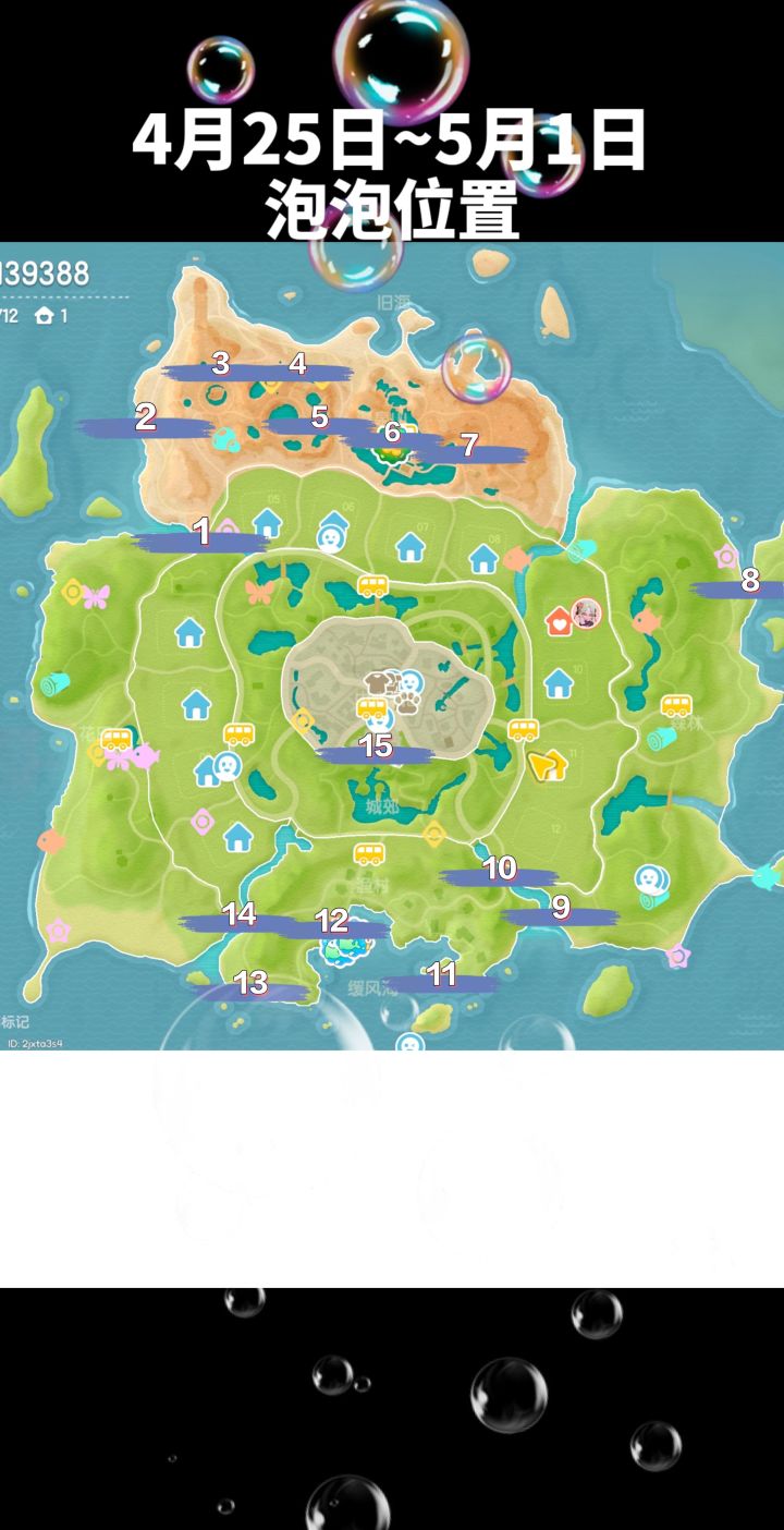 心动小镇泡泡位置4月25日-5月1日本周泡泡位置每周可以拿15个泡泡奖励(每周六刷新)每个宝宝的泡泡都不一样峨随机的(满愿星,金币,家且)#心动小镇 #心动小镇创作计划 #心动小镇泡泡位置 #心动小镇泡泡 #心动小镇家具泡泡