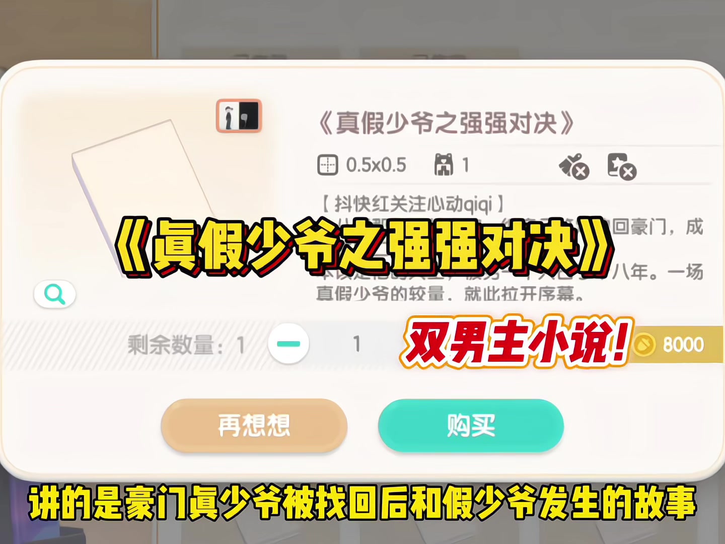 最近上线的书籍创作玩法,煮波也写了!是双男主小说,名字叫《真假少爷之强强对决》,讲的是豪门真少爷被找回后和假少爷发生的故事。人设是霸气总裁和酷拽野狼,全书共四千多字,有4个章节。想看的宝子,快来找我买呀!好友位有限先到先得! #心动小镇 #心动小镇创想团