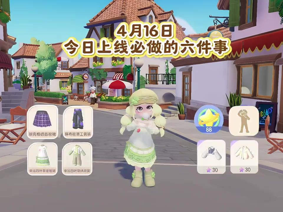 四个金色服饰泡泡 服装店上新 服装图鉴新增幸运四叶草套装 双手拍照动作 春野令物品返场 发展家等级提升至90级#发现好游戏 #心动小镇 #心动小镇攻略 #心动小镇梦光影