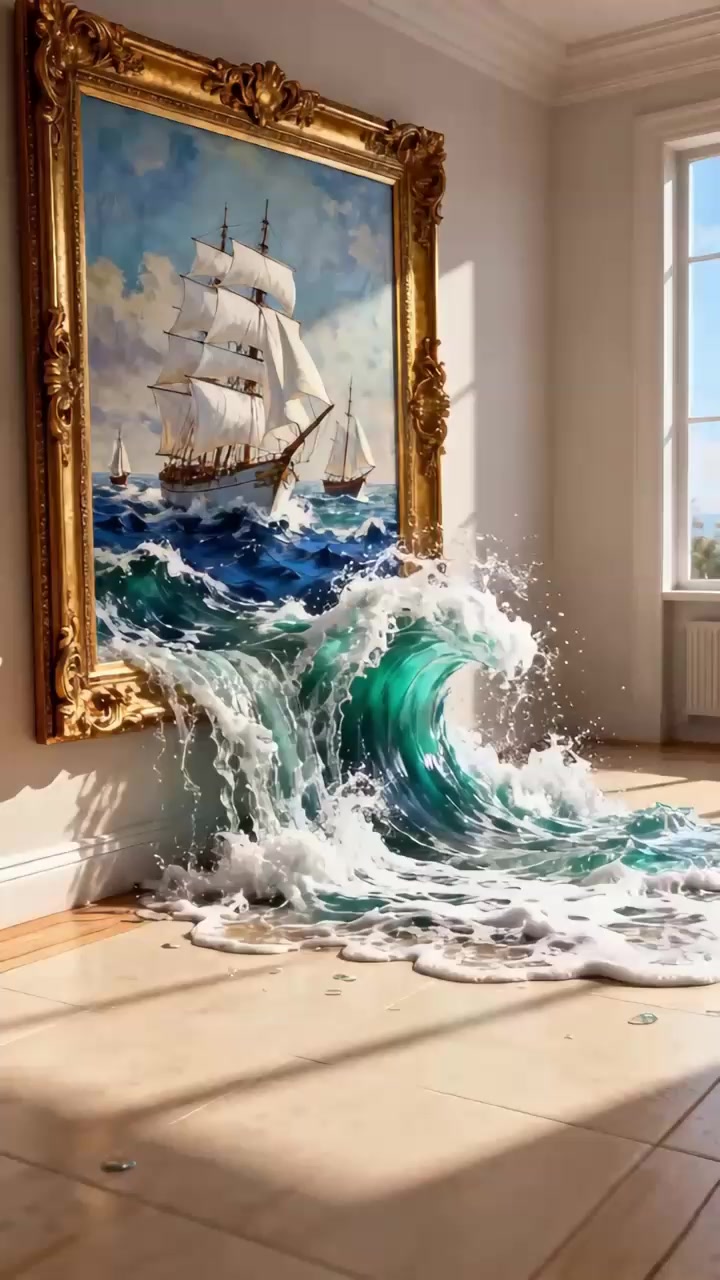 无水印合并视频 船从油画沿着海浪开出到画框外面,船和海浪都从画框里面出来到地面地板上面 两端5秒AI视频合并视频(去水印)2025年12月8日(前5秒),2025年12月11日(后5秒) 图生视频(首尾帧),自己上传图片使用智谱清言AI制作(清影AI)