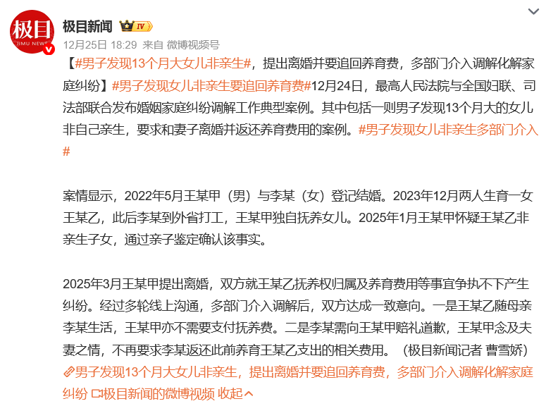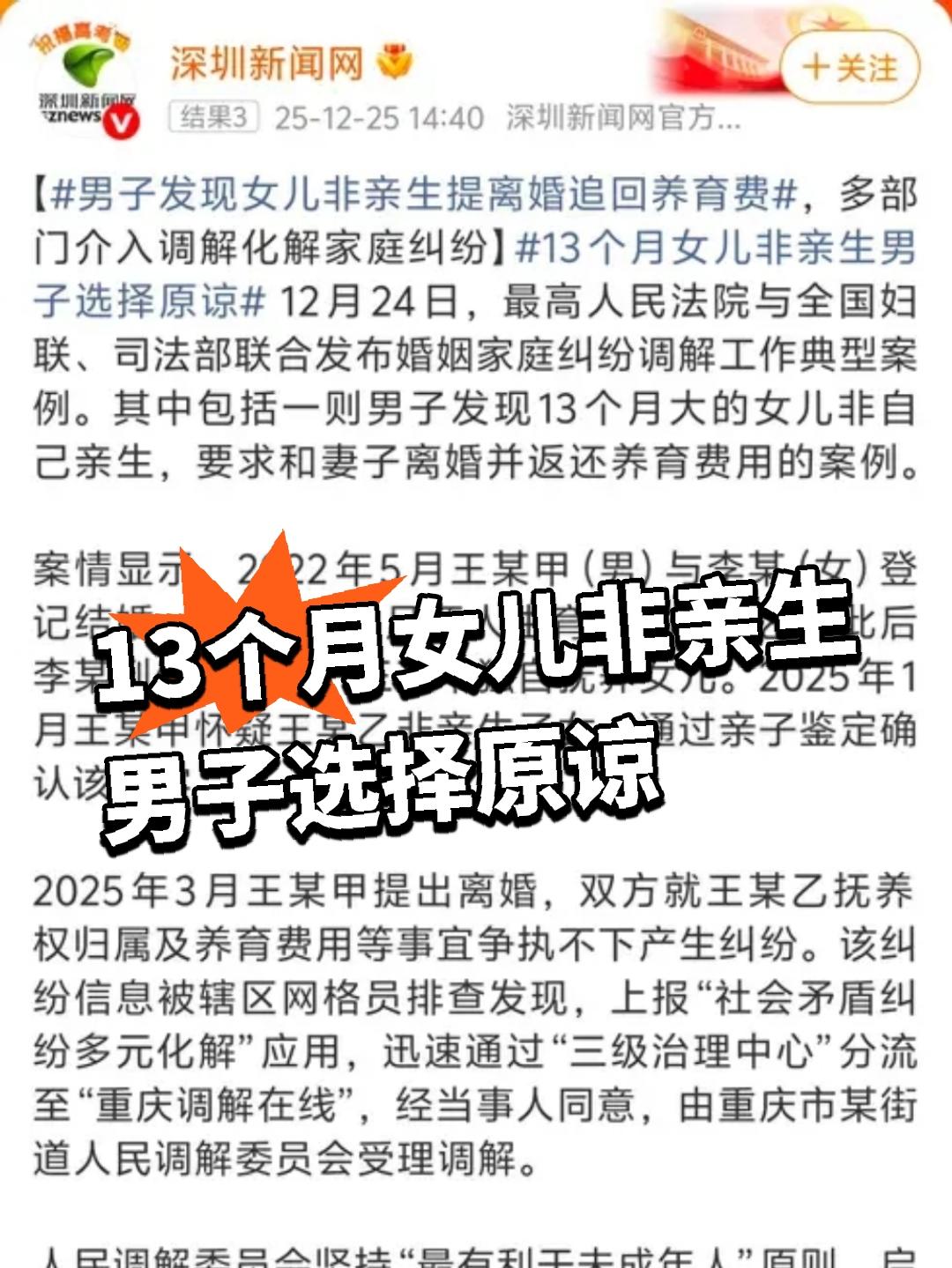 省流一男子发现13个月女儿非亲生,要求离婚追养费用,最后事件调解解决。发现孩子不是亲生的得多崩溃还好事件最后通过调解化解,没有出现更多意外,工作人员辛苦了#生活杂谈 #热点事件