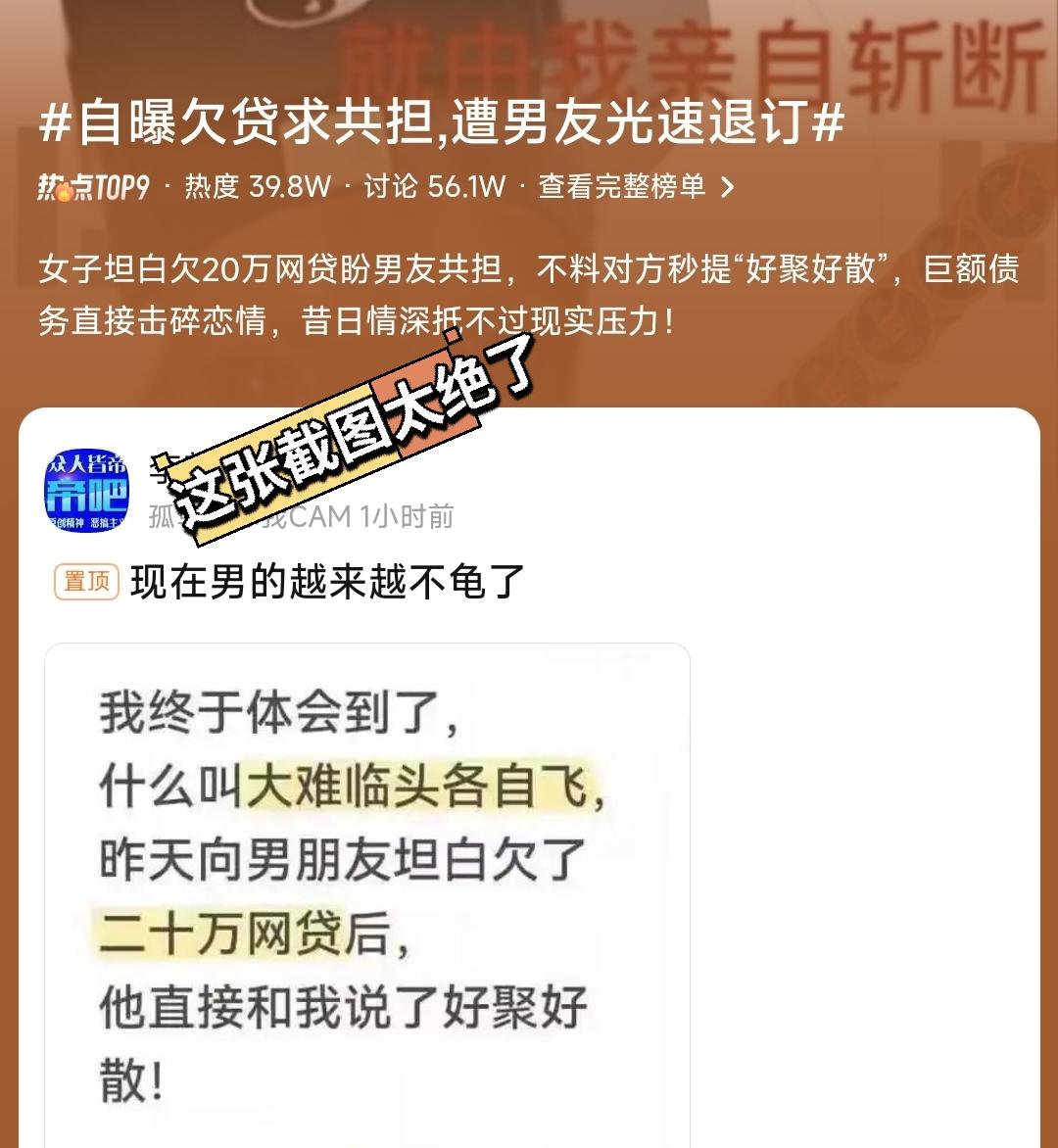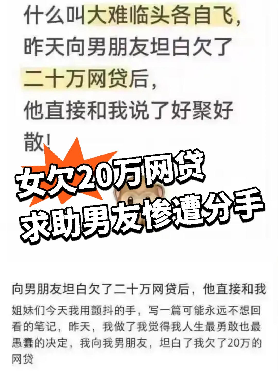 省流女子欠20万网贷求助男友共担,男友立刻提出分手。20万不是小数目,男友直接跑路也是情理之中女孩是好女孩,但是好女孩又不太可能#生活杂谈 #热点事件