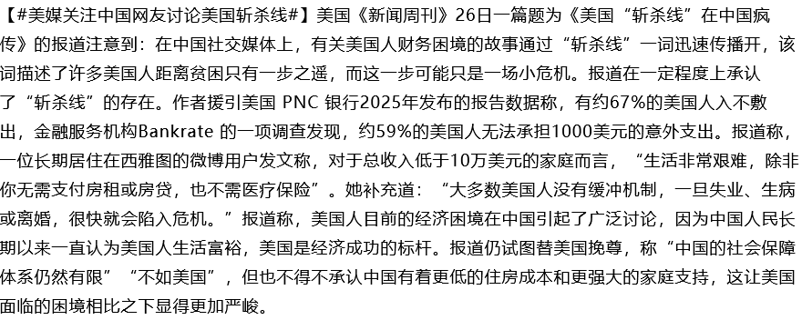 省流近日,在中社交媒体上,有关美人财务困境的故事通过“斩杀线”一词迅速传播开美《新闻周刊》报道相关新闻,称美近70%民众月支出超收入,生活压力巨大。有关斩杀线的一些小故事听着挺难受那边的人过的真惨#生活杂谈 #热点事件