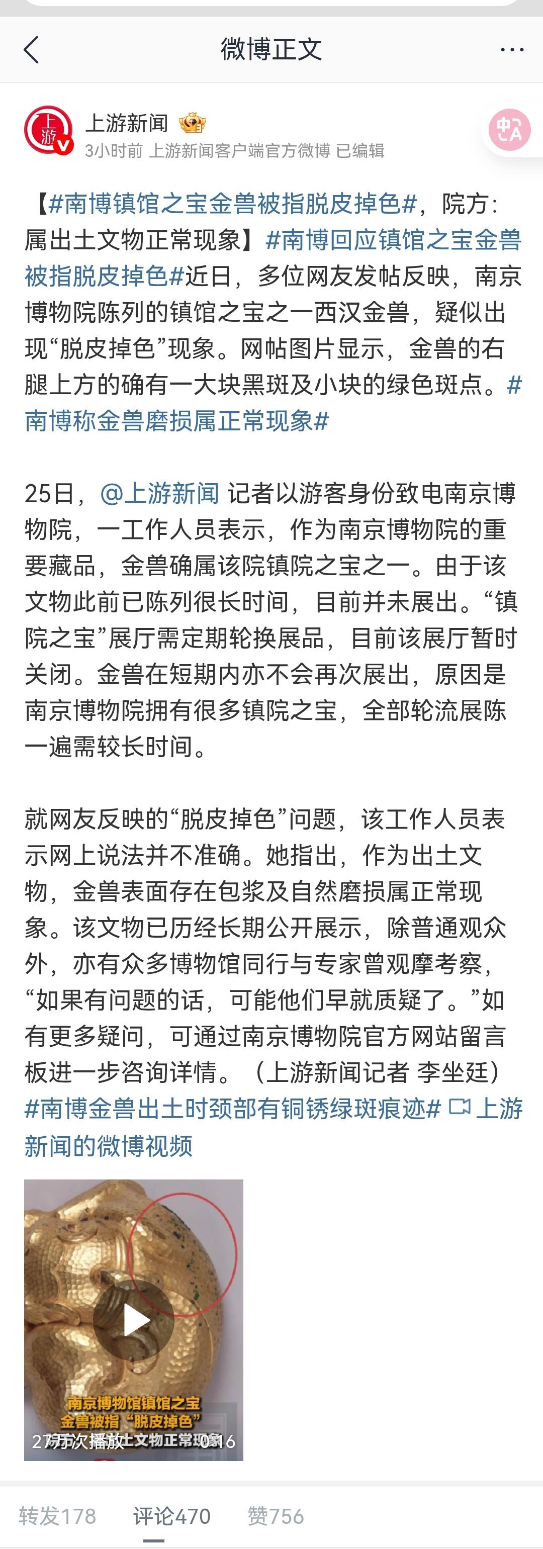 12月25日,针对网络热议的南京博物院镇馆之宝“西汉金兽”出现疑似“脱皮掉色”一事,院方工作人员正式做出回应,明确表示相关痕迹属于出土文物的正常包浆与历史磨损,并非文物受损,目前该文物因展品轮换安排已暂时休展。事件起因于近期多位网友在社交平台发布的探馆照片,画面显示这件有着两千多年历史的金兽右腿上方出现了一块明显的黑斑,周边还伴有零星的绿色斑点。部分网友因此质疑文物是否因维护不当而出现了“脱皮”