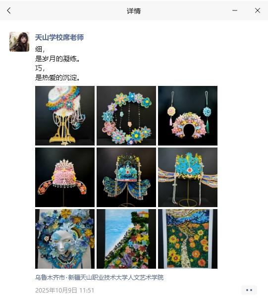 大学老师朋友圈2025年10月9日星期四朋友圈文本内容细,是岁月的凝练。巧,是热爱的沉淀。新疆乌鲁木齐市新疆天山职业技术大学2025年10月9日早上11:52(yǎn)衍纸工艺(彩色卷纸)大学学生作品衍纸(也叫纸卷艺术)是用细长纸条卷曲、粘贴成造型的手工艺术卷纸作品图片分辨率1080 x 1440