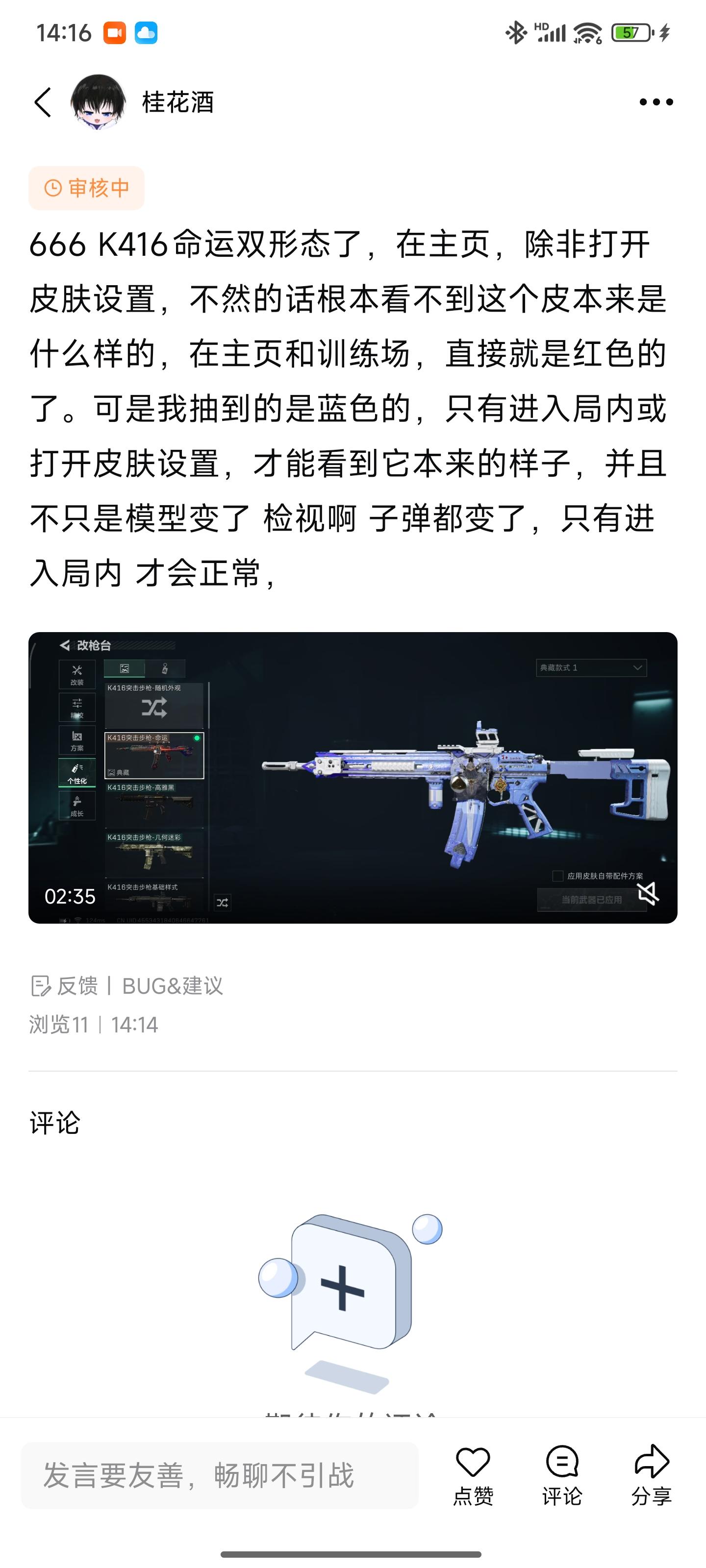 666 K416命运双形态了,在主页,除非打开皮肤设置,不然的话根本看不到这个皮本来是什么样的,在主页和训练场,直接就是红色的了。可是我抽到的是蓝色的,只有进入局内或打开皮肤设置,才能看到它本来的样子,并且不只是模型变了 检视啊 子弹都变了,只有进入局内 才会正常#三角洲行动 #三角洲行动bug