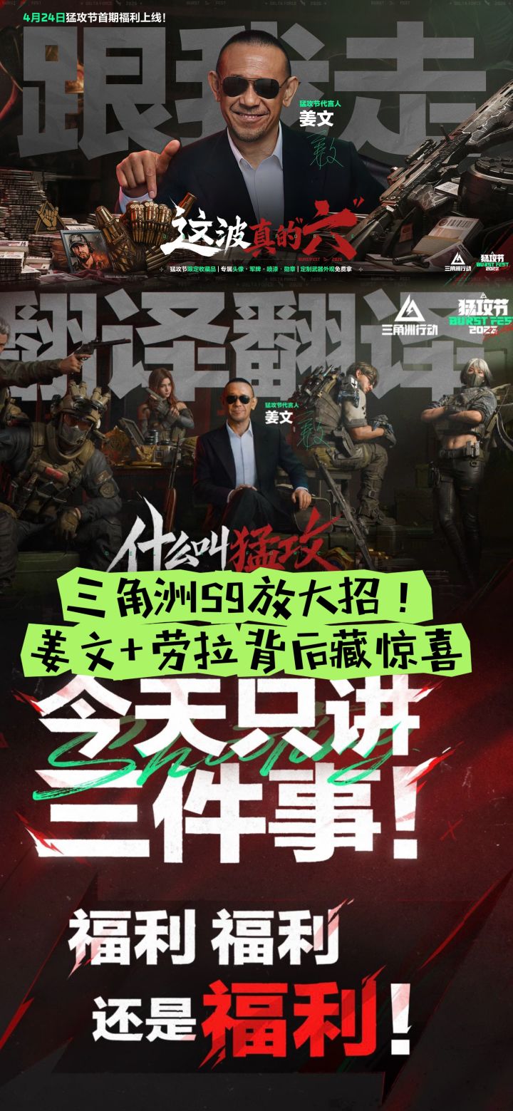 姜文上任三角洲!4月24日猛攻节首期活动开启,4月30日猛攻节活动及福利全面上线!希望所有干员都能找到属于自己的猛攻方式。 猛攻节参与活动可免费得2600 限时三角券、14 张定制装备券、猛攻节限定大红、猛攻节主题武器外观、限定成就勋章、姜文定制外观三件套等;还有全新玩法,开砖必出红、身份牌换大红!限时开放全新模式烽火挑战,无负担尽情猛攻!全面战场上线全新超载模式、4 款限定载具外观免费领取! #