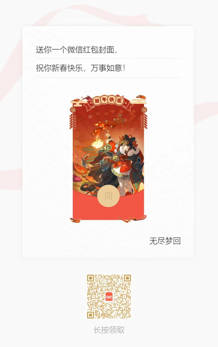 🧨春节|新年快乐 🧨辞暮尔尔,烟火年年㊗️大家如愿以偿,美梦成真!————————红包封面100个先到先得!❤积分商城上新福利❤积分商城于1月29日(大年初一)20:00进行库存上新,并开启积分商城新春抽奖活动。商城入口:关注《无尽梦回》官方微信公众号,菜单栏【福利合集】-【积分商城】