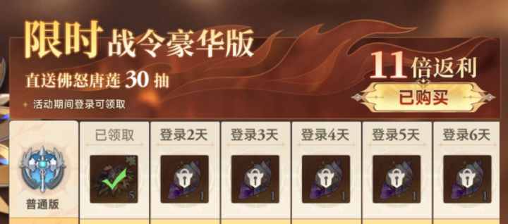 佛怒唐莲的强度在上篇攻略中已经说了,以下是本次活动的攻略,包括从白嫖、小氪到中氪、大氪,大家按需自取。※暗器卡池是40抽纯保底,根据群内大家的反馈来看,实际大概在36~38抽就会出,总的来看此次活动卡池相对是比较福利的,当然不仅仅是因为保底抽数少,具体我会再下文说。 白嫖:首先还是看活动的给的免费资源,总体来看属于是非常福利了。共计40多暗器抽+5暗器碎片+10普池抽 ①本期活动免费战令可