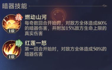 题外话:佛怒唐莲原著中属于范围杀伤最强的暗器之一,能够瞬杀绝顶强者,游戏里佛怒唐莲的技能设计上和原著贴合度还是比较高的。 佛怒唐莲定位【真实伤害】、【能量扣除】,实际该暗器的强度远超这两个定位的总结,下文我会具体分析下之所以“强度超模”的原因。 定位一:【真实伤害】佛怒唐莲的“真实伤害”主要来源于以下两个方面:(1)首先是暗器的出战技能燃动山河,1级即可在首回合造成全体暗器伤害并附加敌方生命