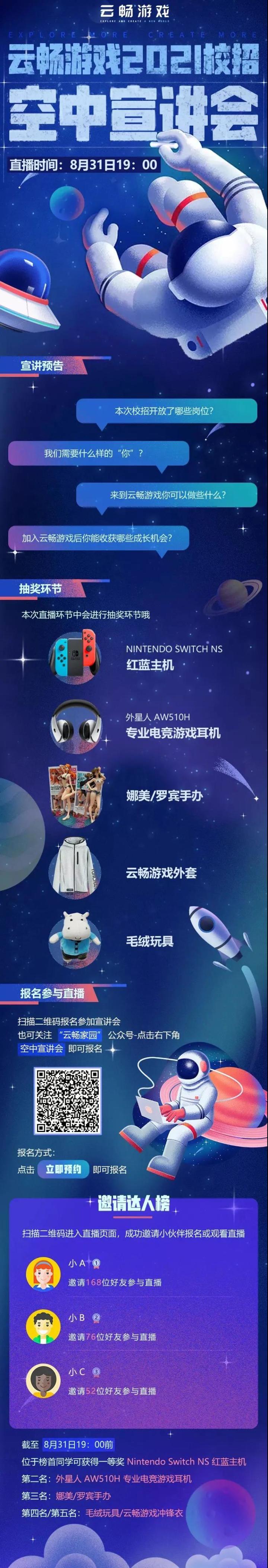#云畅招聘#“让我看看是谁在发大奖‘’“哟!是云畅游戏的哇”8.31,8.31 ,8.31!重磅豪礼送不停:NINTENDO SWITCH NS (红蓝主机)外星人 AW510H (专业电竞游戏耳机)娜美/罗宾手办等赶快参与云畅空宣会吧~世界顶级IP《航海王》《鬼泣》offer和你只差一个空宣会的距离!点击下方图片,扫描二维码报名参加宣讲会也可关注“云畅家园”公众号--点击右