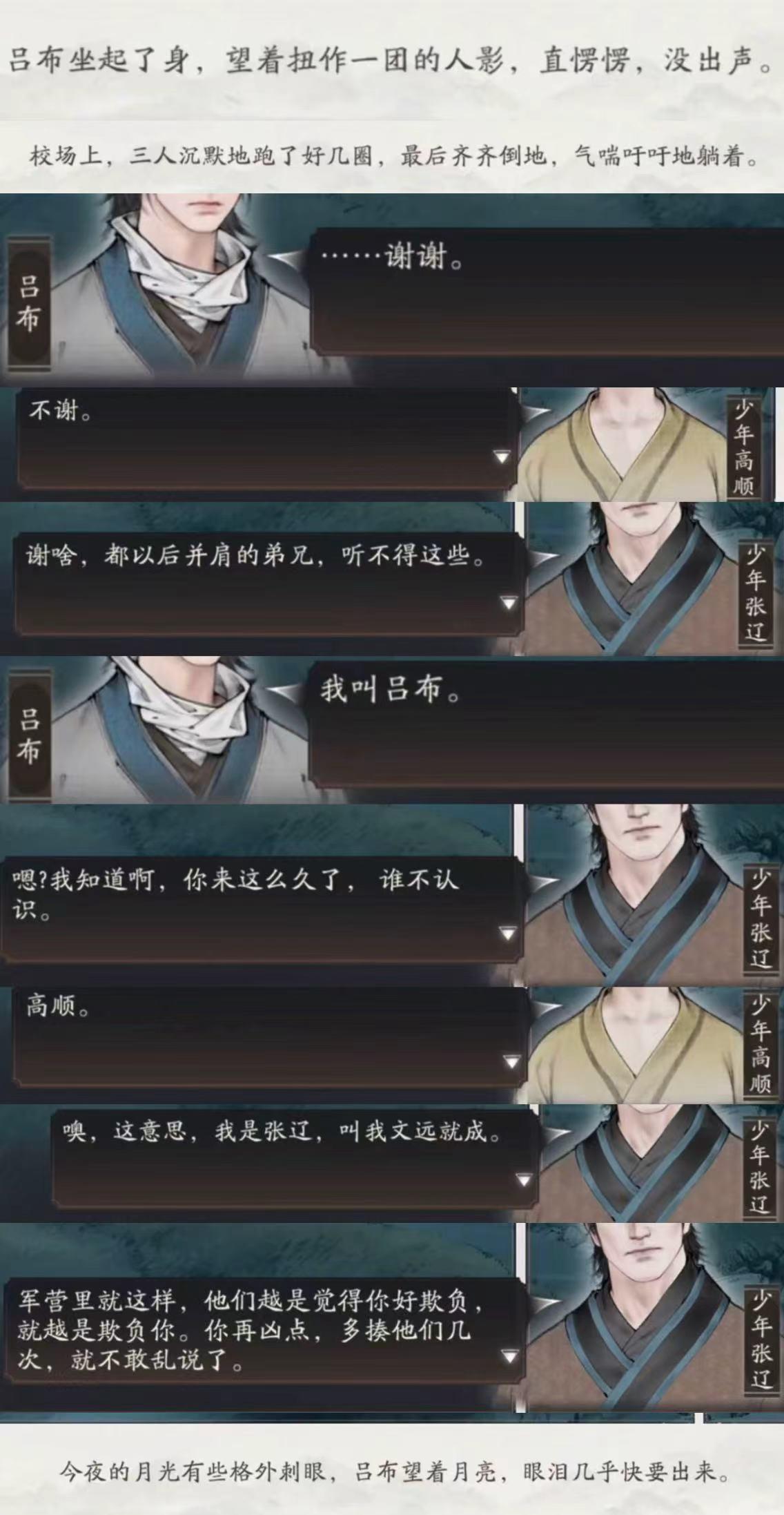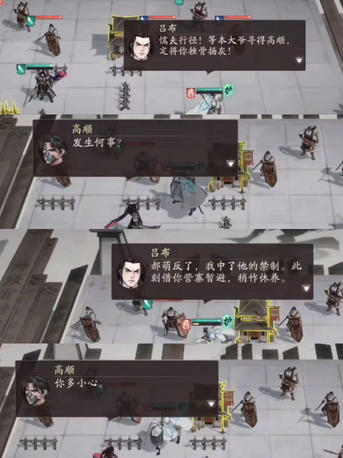 白门楼见证吕布枭雄末路,见证陈宫慷慨就义保全亲族,见证张辽降入曹魏新的开始,而高顺,是于敌于己都最意难平的。 三望剧情中,吕布张辽高顺少年时便在军营相逢,吕布正囿于“天煞孤星”谶语被兵卒霸凌,张辽和高顺冒险救他,张辽教他如何以威势对抗、立足,高顺只是附和,并率先读懂吕布结交的意愿。 吕布背叛过很多人,也有很多人并未完全信任他。但高顺是令人遗憾的一个。他有治兵之才,从未背叛过吕布,可吕布却从未对