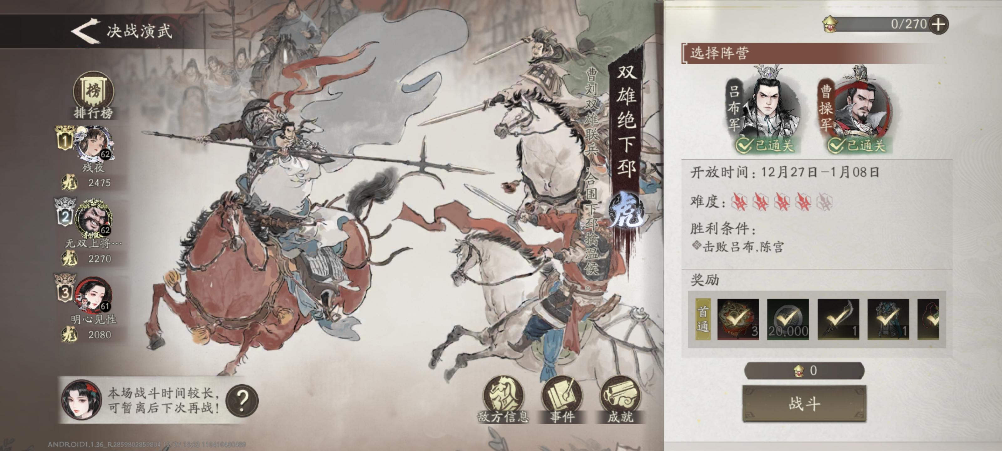 重点,借一个满阶吕布,用这3个技能,貂蝉必备,剩下的有啥用啥,最好是跑的快的。上面放赵云和张辽,赵云带上李典和张辽利用马厩玩命往下跑,堵路的3个张飞收掉,外城不要恋战,吕布三人组尽量一波收,把吕布血量压制在20再让他跑,然后借的吕布利用驿站追对方吕布,在他回内城之前杀了。全部利用马厩往右下的门跑,集中一下把追兵杀完,冲进内城,哗变之策,除了陈宫,都能哗变上,让他们自相残杀,同时控制好血线,用吕布开