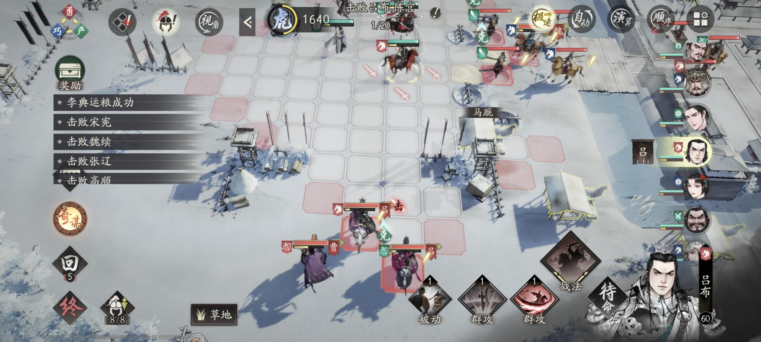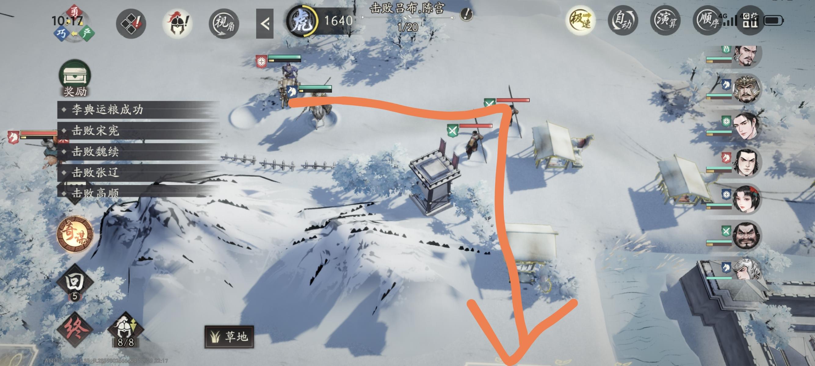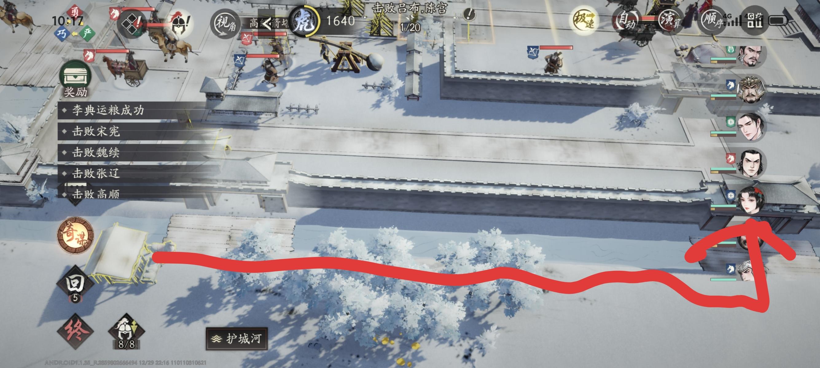 感谢大佬提供思路(图2),我只是整理一下。我的练度可以看图三。第一步(图4)借个大佬的顶配吕布。张辽上加速,陈群给貂蝉上加速。然后顶配吕布冲下去打电脑吕布,貂蝉上来给吕布再动,把电脑吕布血量压下来,吕布会逃跑。其他人跟上第二步(图5),不要李典成就可跳过,赵云驮着李典去完成任务第三步(图6),所有人按剪头去堵吕布第四步(图7),杀了吕布去下一个门集合,准备偷陈宫第五步(图8),放个哗变集