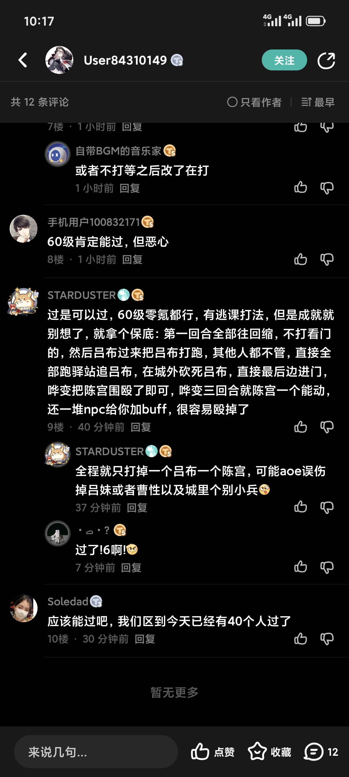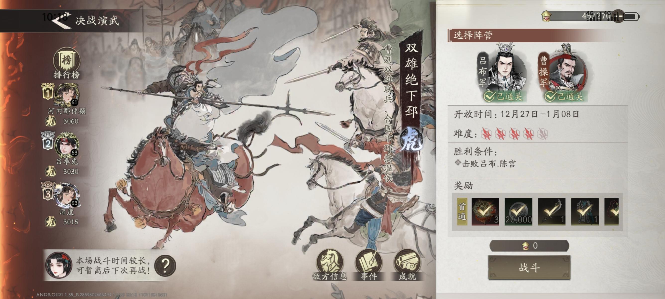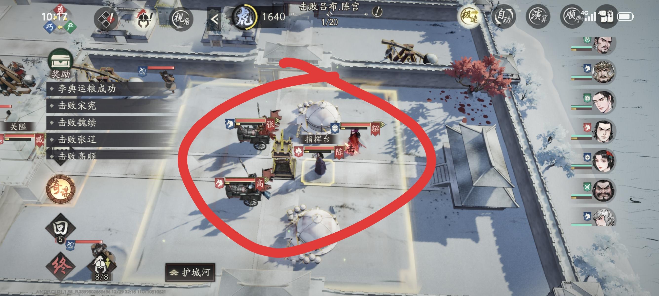 感谢大佬提供思路(图2),我只是整理一下。我的练度可以看图三。第一步(图4)借个大佬的顶配吕布。张辽上加速,陈群给貂蝉上加速。然后顶配吕布冲下去打电脑吕布,貂蝉上来给吕布再动,把电脑吕布血量压下来,吕布会逃跑。其他人跟上第二步(图5),不要李典成就可跳过,赵云驮着李典去完成任务第三步(图6),所有人按剪头去堵吕布第四步(图7),杀了吕布去下一个门集合,准备偷陈宫第五步(图8),放个哗变集