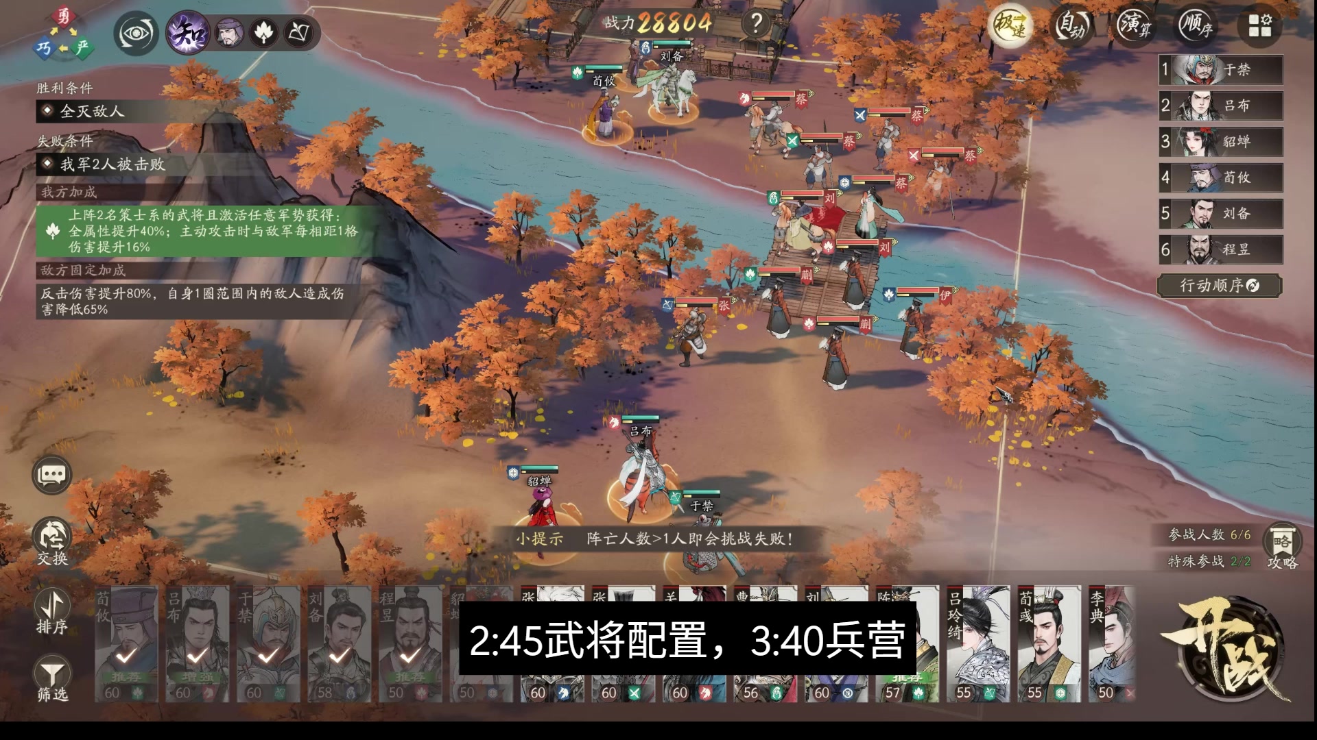 3星吕布,1星貂蝉,3星荀攸,3星9阶程昱(2星即可),2星11阶于禁,4星刘备。 副将没有抽的。 装备55+8或60紫+6。 兵营只有骑兵的伐众点到5了,其他皆为0-1。 尝试过程中发现了一个站位可以骗敌人吃追击和反击,可以一轮清策士。再加上看论坛都刚需5星吕布,6星张飞,或者赵云。于是录了个视频,希望有所帮助。 上程昱是为了捧日封技防aoe,以及上减益防驱散牵制,否则吕布吃一发普攻加撕裂就死了