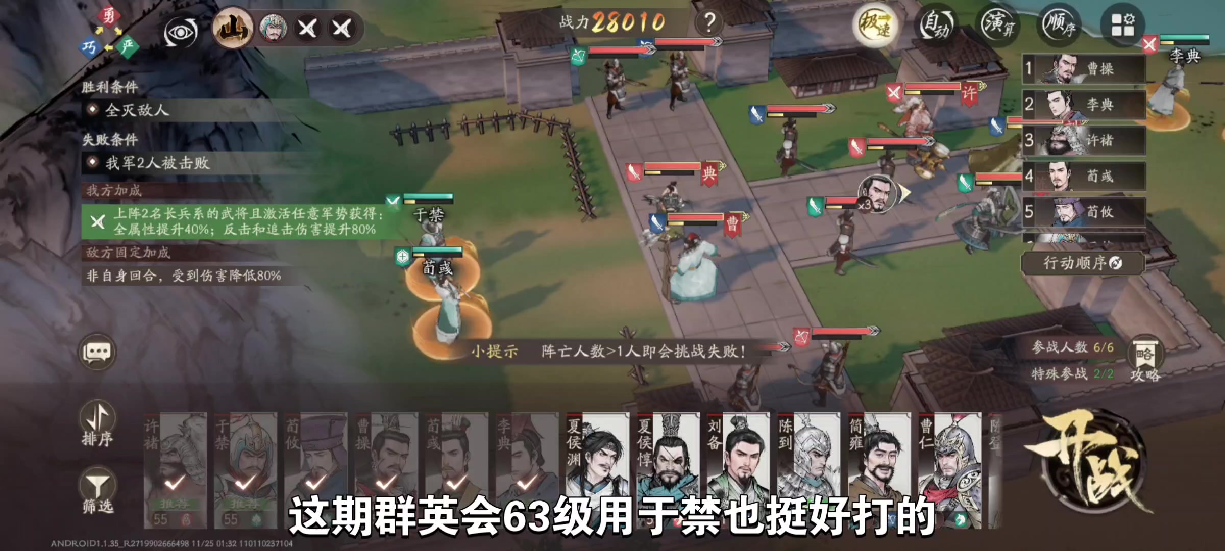 过了但没录屏,视频是之前试错时期的,以为结束能保存后面就没重新录,结果不仅没有回放保存,还不能重新打。下面是实际过时的思路 开头思路差不多,主要更改为荀攸开局直接计略百出+十二奇策,而不能打双十二奇策,这样后面可以转好技能,期间技能全对着刘备就行。于禁(主将)带克敌先机和暴击回血在第二回合走到位置后只靠平A打张辽前单位或者刘备,一直到下回合会被许诸或典韦时放克敌先机。荀彧期间基本上可以全用援兵,