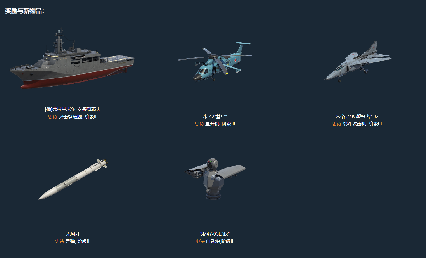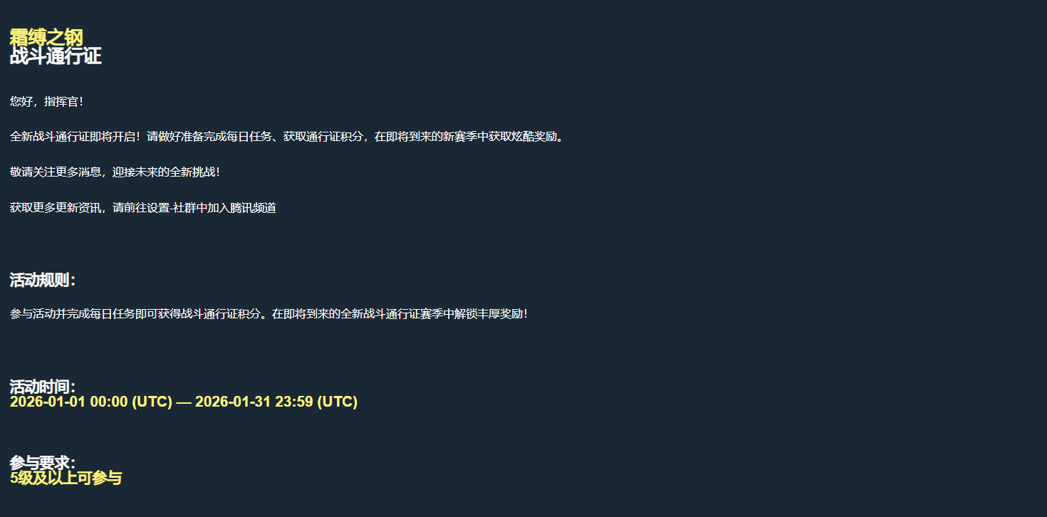 《现代战舰》0.100版本“寒钢战线”更新预告 亲爱的各位舰长: 《现代战舰》将于2026年1月14日0点更新0.100版本“寒钢战线”。 以下为本次0.100版本更新内容: 全新战斗通行证《寒钢战线》 ●通行证共有40个等级,每级都将提供高价值奖励。●完成全部等级以获取赛季主要奖励——弗拉迪米尔·安德烈耶夫 突击登陆舰。 三级突击登陆舰:弗拉迪米尔·安德烈耶夫武