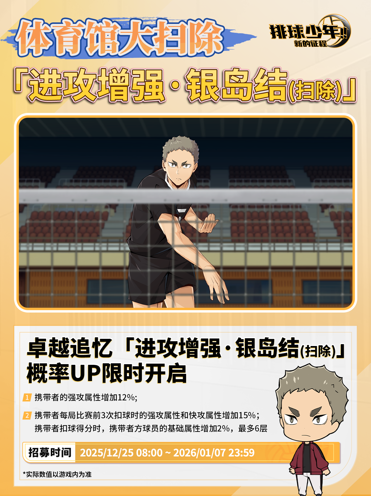 “我们技术都不好,因此,只能多练习了吧!”SP球员「银岛结(扫除)」限时卡池招募活动即将开启!▷▷卓越招募时间:12月25日8:00 ~ 1月7日23:59>>互动有奖<<关注@排球少年手游 并在评论区留言你对 「银岛结(扫除)」 的初印象,截止2026年1月20日23:59 将随机抽取5名玩家送出镭射票(随机)1份。#排球少年 #排球少年手游 #排球少年新的征程 #排球少年1025新的