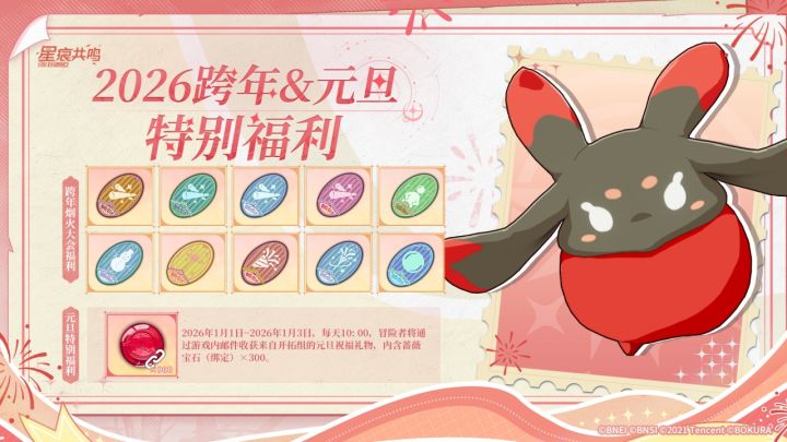 冒险者!新的一年即将到来~12月31日 23: 30,阿斯特里斯海滩将上演一年一度的“跨年烟火大会”。请冒险者与伙伴们携手前往阿斯特里斯海滩,在漫天烟火下,在欢声笑语中,与亲密的伙伴,共同迎接新一年的到来。活动开始前,冒险者将通过游戏内邮件收到来自开拓组的跨年烟火大会特别福利,内含:玩具·小伊烟花 ×5、玩具·仙女棒 ×2、玩具·黄色应援棒 ×1、玩具·青色应援棒×1、玩具·绿色应援棒×1、