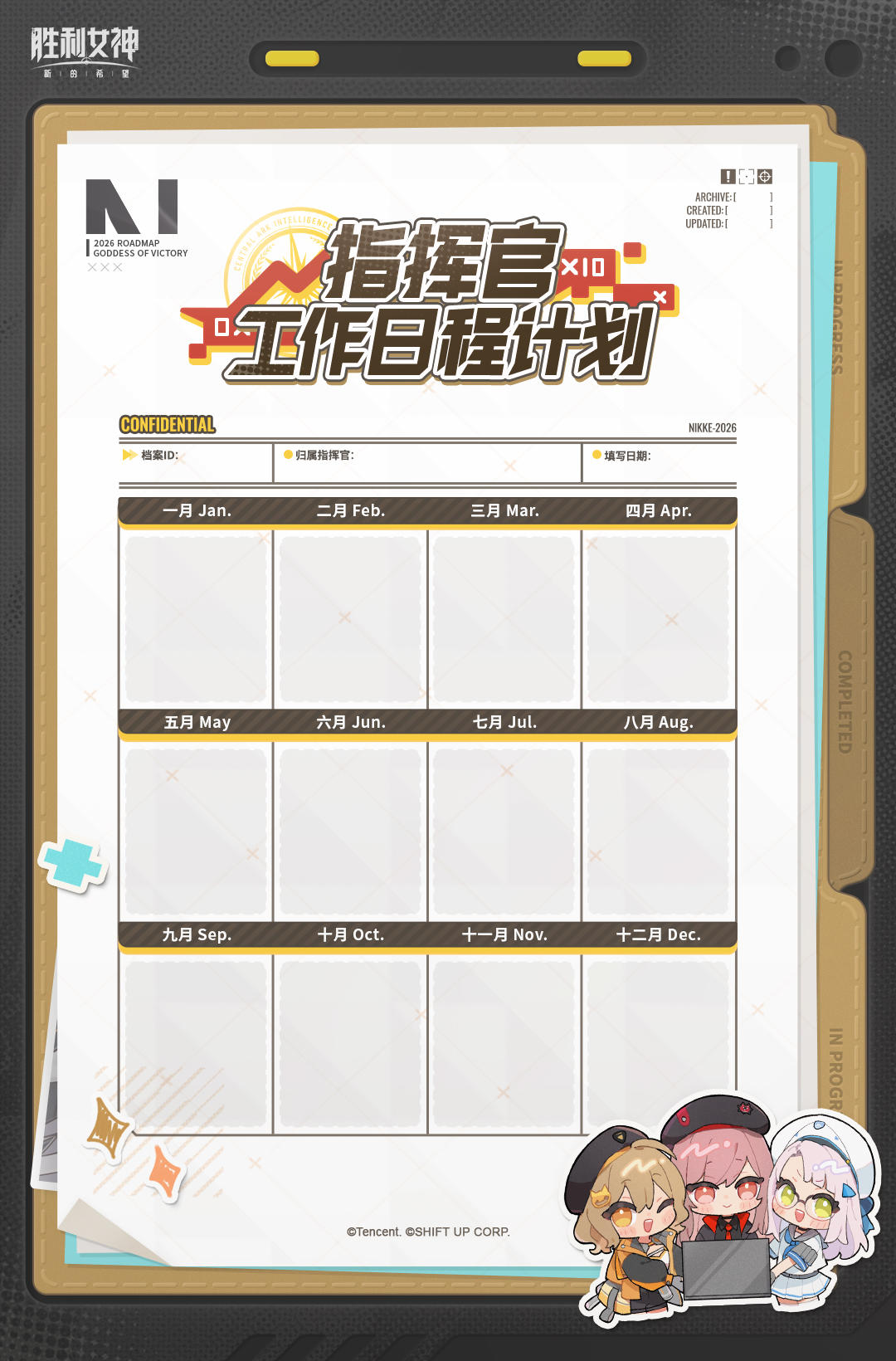 拉毗递上2026年的《指挥官工作日程计划》,指挥官,您对2026有怎样的展望?快来填写您的「年度计划」吧~告诉我们在未来一年里,您计划见到哪些妮姬,又想与她们展开怎样的精彩篇章!🎁请在计划表中写上你想先见到的妮姬!还未遇到过的妮姬也可以填写噢~将填写好的计划图分享在评论区,我们将在1月27日从评论区抽1位指挥官,送上【2026年单向历】一份;再抽5位指挥官,送出【随机冰箱贴】一份!#胜利女