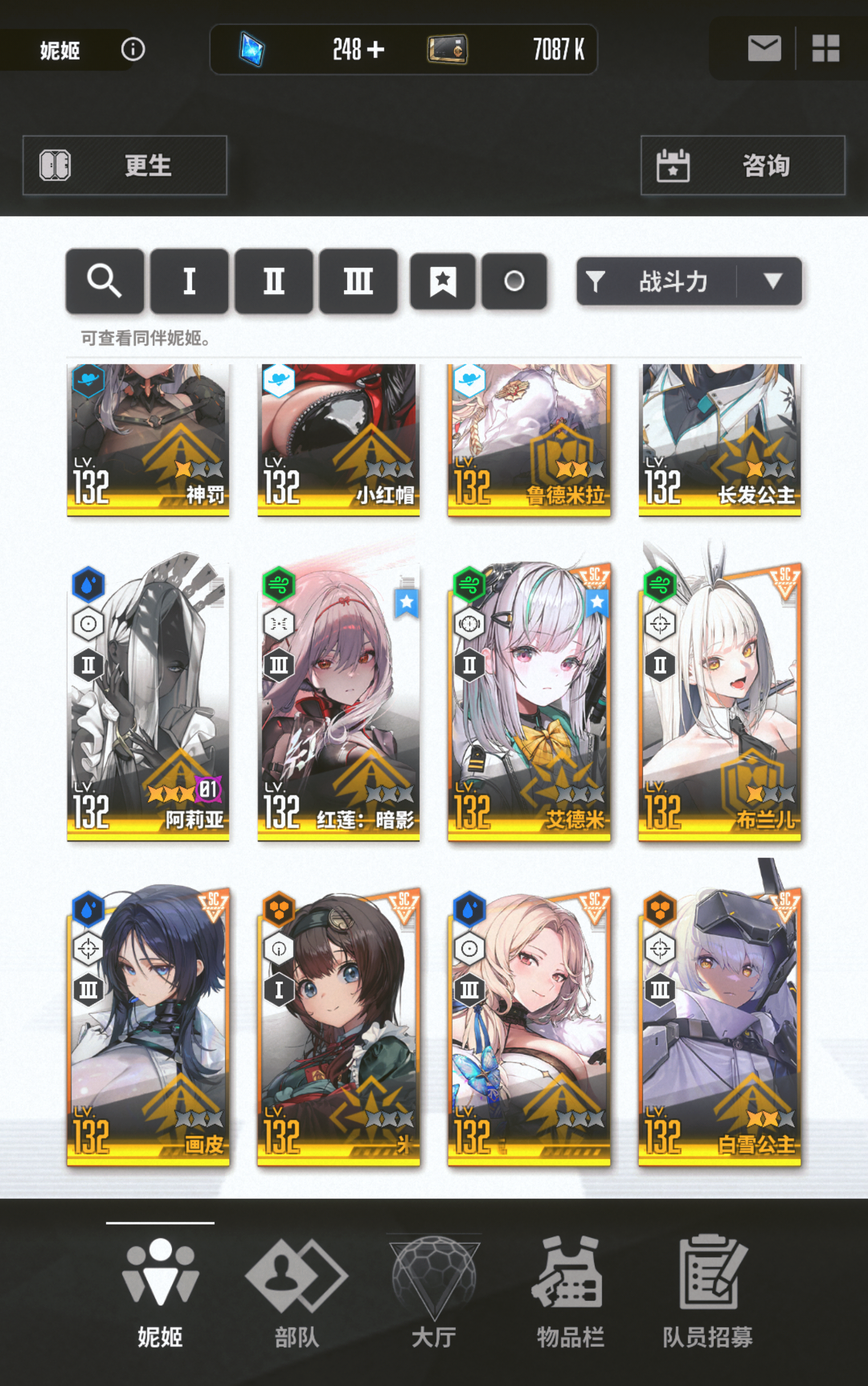 桃乐丝免费22抽2只,神罚免费100抽2神罚、1红莲,红帽池700抽出5红帽、1白雪、1哈兰、1神罚、1桃乐丝、1伊莎贝尔,(140抽3红帽、1神罚、1桃乐丝,抽完140抽还有240K钻石,为了歪诺雅长发抽到700抽)黑莲100抽2只,(30抽1黑莲,为了歪诺雅长发抽到100抽)水阿免费100抽3只,豺狼30抽,渡鸦70抽1渡鸦、1红莲,伊芙20抽,画皮免费10抽,婴宁免费10抽